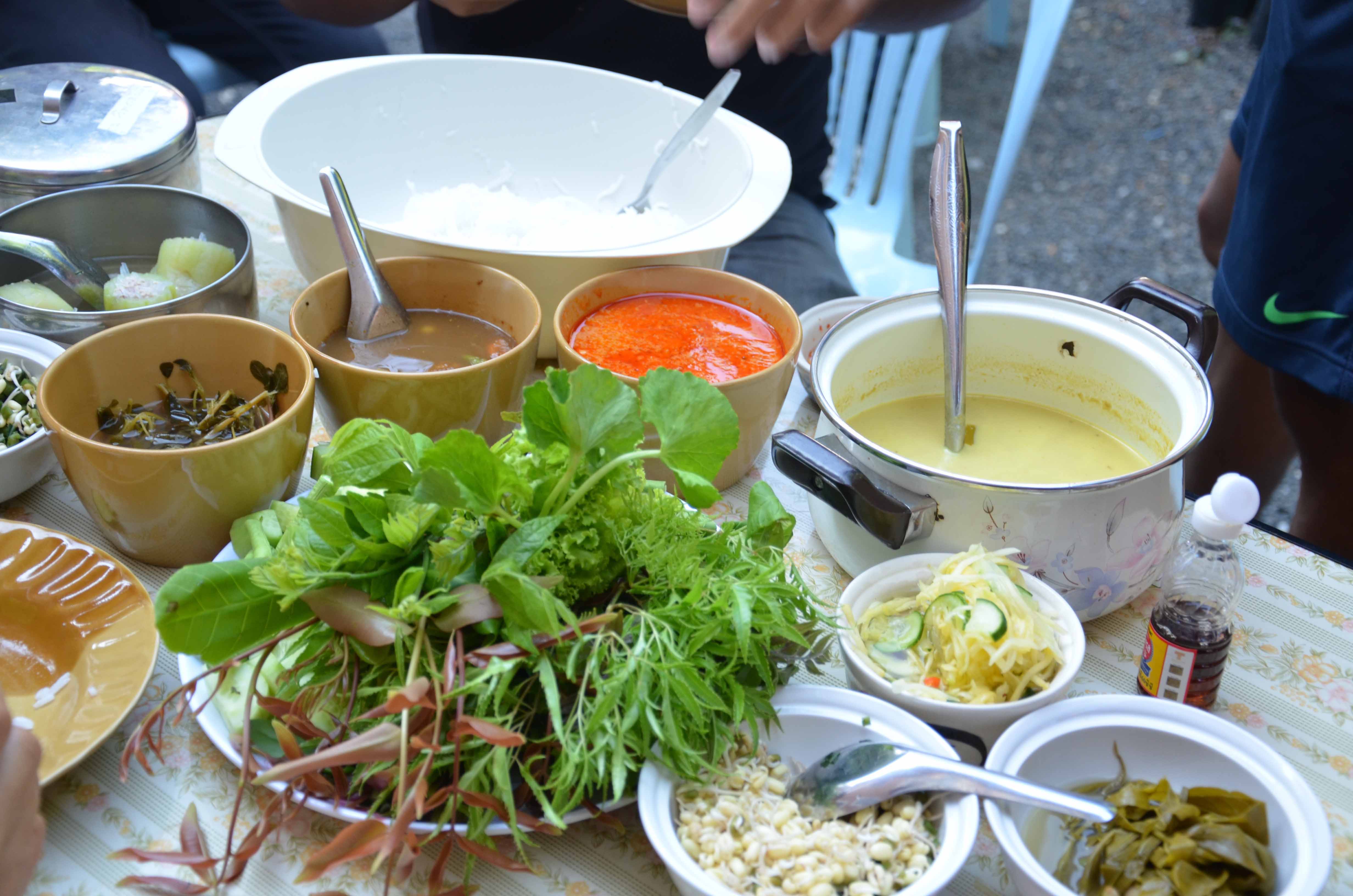 ว่าแล้วก็ลงมือกันเลยยย ซึ่งน้ำยาของทางใต้จะเป็นน้ำยากระทิที่มีสีเหลือง ไม่เหมือนภาคกลางที่มีสีส้ม ใช้ปลาทะเลต้มแล้วก็มาตำให้ละเอียดให้เนื้อมันเนียนและฟู จากนั้นจะละลายพริกแกงซึ่งเป็นสูตรของทางใต้โดยเฉพาะกับหางกระทิตามด้วยหัวกระทิและเนื้อปลาจากนั้นปรุงรสตามใจชอบ ซึ่งตอนเคี่ยวเนี่ยต้องระวังกระทิแตกฟองด้วยนะคะ อีกถ้วยสีส้มๆคือน้ำยาน้ำพริกมีรสชาติหวานๆผสมกับถั่ว อีกหนึ่งน้ำยาทีเด็ดเลยคือ "น้ำยาแกงพุงปลาา" หรือแกงไตปลาที่เราเรียกกันนั่นเอง โอ้โห้ววหรอยแรงจนตกยกนิ้วให้เลยทีเดียว โดยคนที่นี่จะเน้นกินเส้นน้อยๆน้ำเยอะๆ ผสมกับผักดองต่างๆ เช่น ถั่วงอกหัวโต อาจาดต่างๆ และที่ขาดไม่ได้จะต้องมีทุกมื้อคือผักสด อิ่มอร่อยไปแบบสไตล์อาหารเช้าวิถีคนตรังแล้ว ต่อจากนี้เราก็พร้อมที่จะลุยเราก็ตัดสินใจที่จะลาพี่มิวและครอบครัวเพื่อไปตามทางแต่สุดท้ายพี่แกก็บอกว่า ข้างๆบ้านลุงที่รู้จักกันมีรถรับจ้าง จะไปไหนเวลาน้อยไปโบกรถมันรอนานเดี๋ยวได้เที่ยวน้อย ถ้าจะตามแผนก็ไปจ้างลุงมั้ย