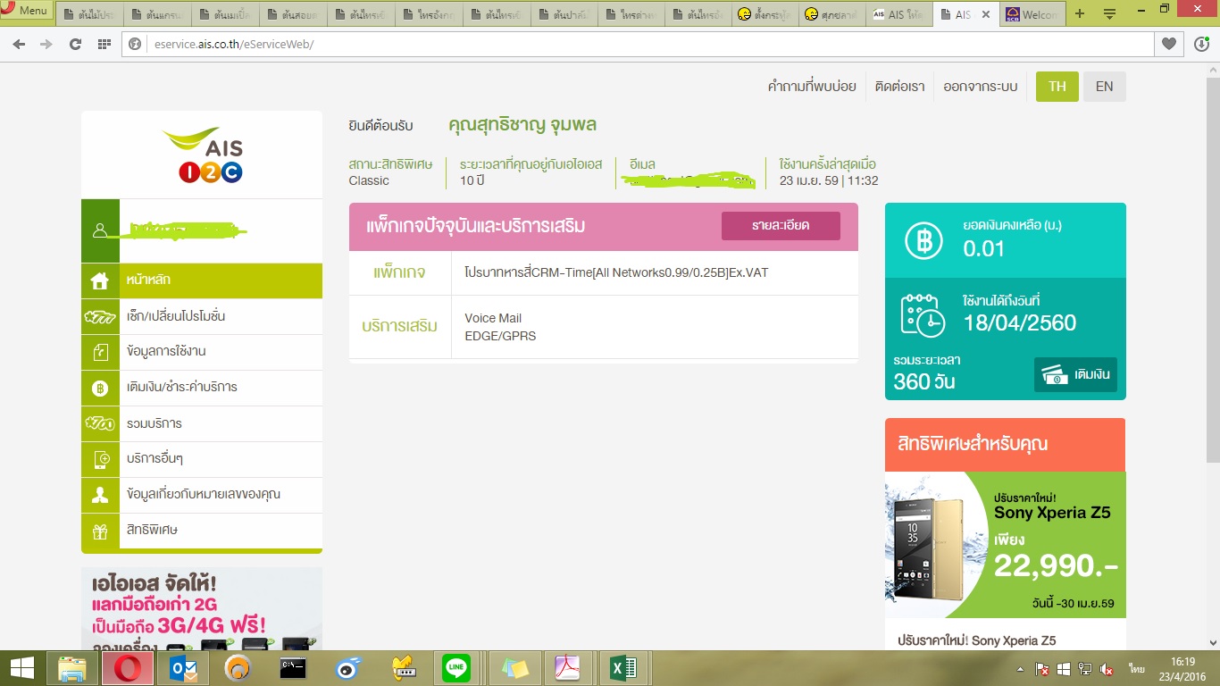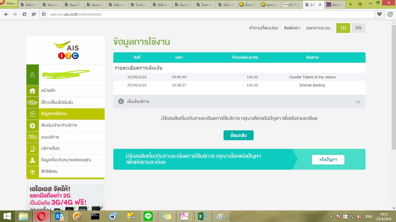 เติมเงินวันที่ 20 เมษายน 2559 จำนวน 100 บาท