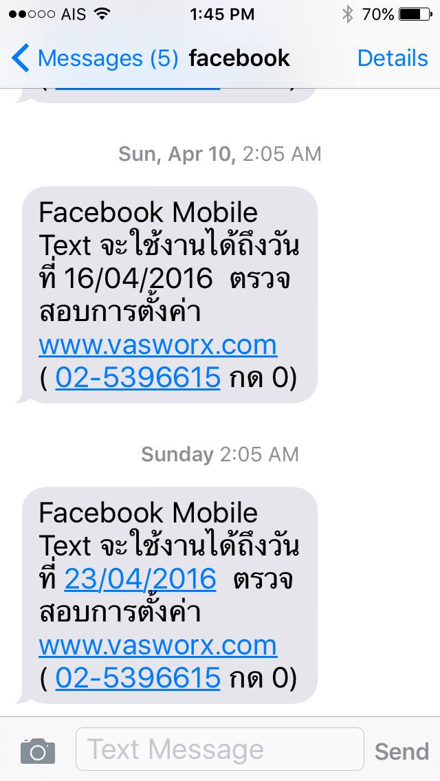 ได้รับSMS ข้อความว่า"บริการFacebook mobile textจะใช้ได้ถึงวันที่........ตรวจสอบการตั้งค่าที่......" โดยไม่รู้ว่าการได้รับข้อความนี้คิดค่าบริการครั้งละ9บาทสัปดาห์ละครั้ง 5ปีมาแล้ว และไม่เคยได้รับบริการอย่างอื่น