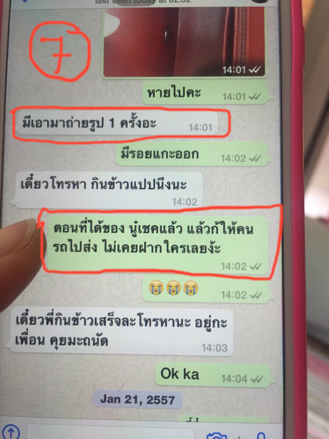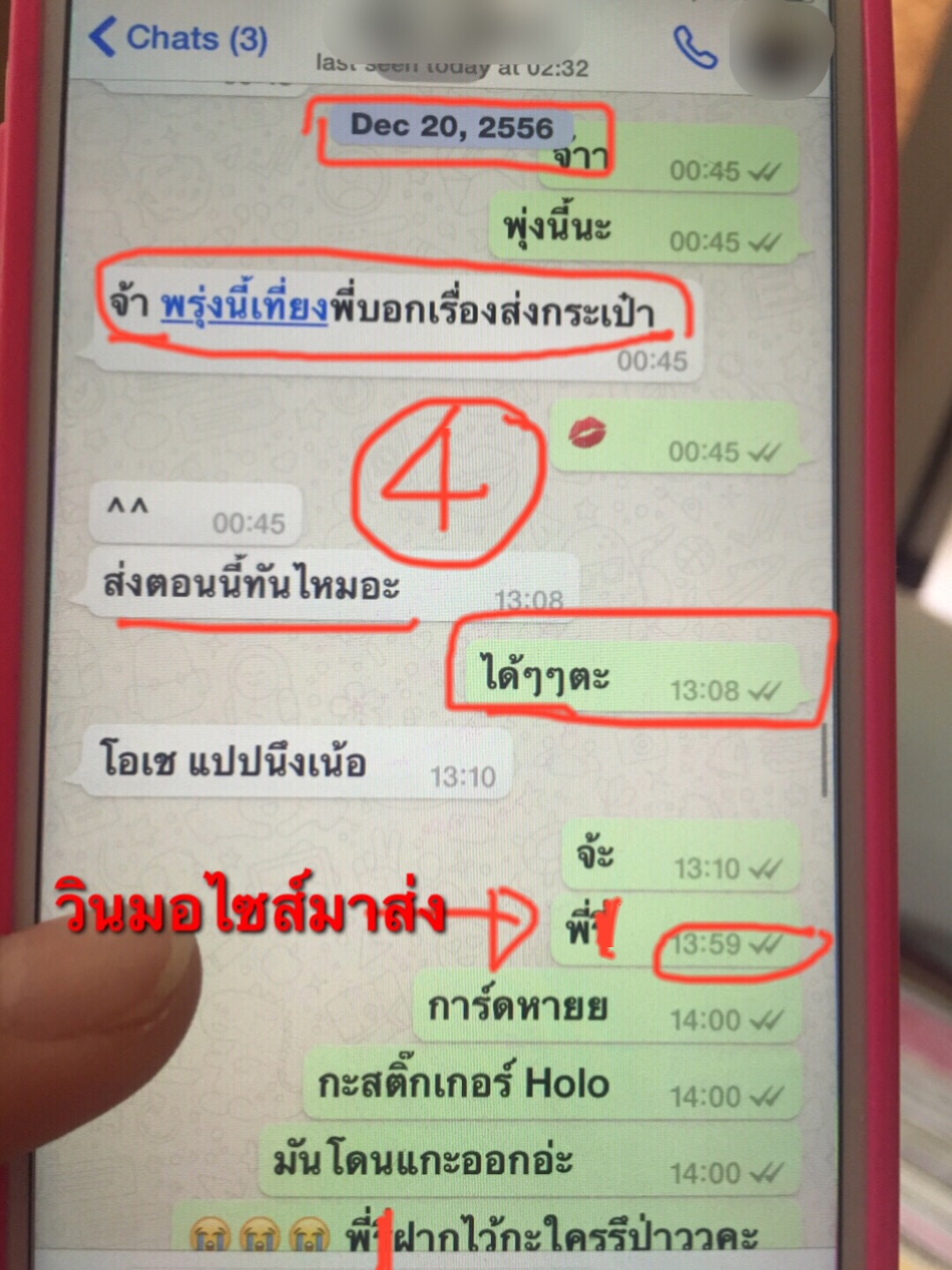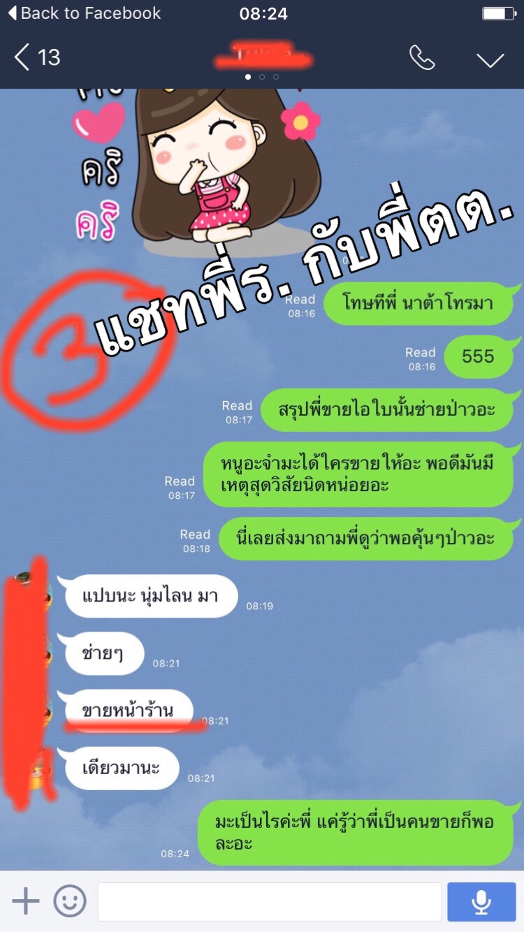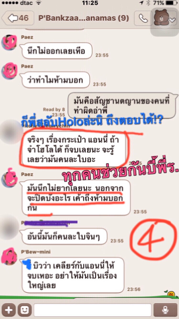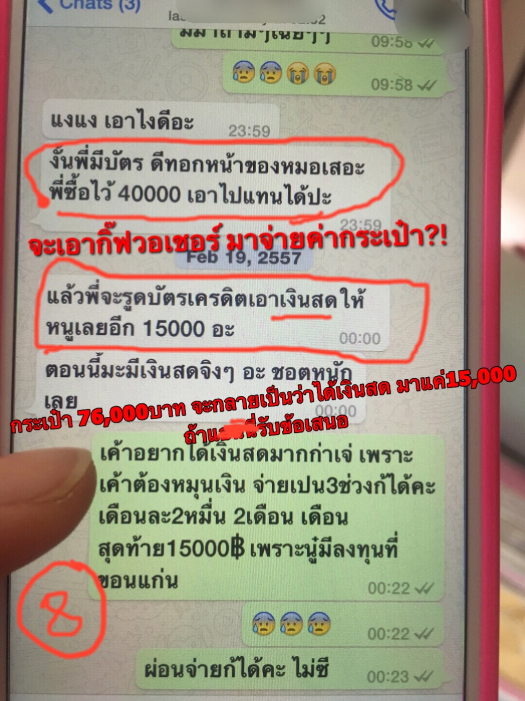 -จากนั้นพี่ร. ก็โดนคนในกรุ๊ปไล่ถาม จนพี่ร. ลากพี่ตต เข้ามาในกรุ๊ป (ลากเข้ามาเพราะเตี้ยมกันมาล่ะ55) พี่ตต. กะพี่ร. เวลาหายก้หายไปพร้อมๆกัน แบบไปเตี้ยมกันสักพัก กลับเข้ามาตอบก้มาตอบพร้อมกัน หึหึ อยู่ในกรุ๊ป พี่ตต. ก็ตอบแค่ว่าขายให้ลูกค้าขาจรไป ในราคา5หมื่น อปก.มีครบ แต่ยกเว้นการ์ดและHolo หึหึ! ! หลังจากนั้นไม่นาน พี่ตต. ก็ได้ออกจากกลุ่ม!!(ก่อนออกจากกลุ่ม เรากะรุ่นพี่อีกคน ที่เป็นทนาย โทรไป3สาย เพื่อเคลียร์เรื่องกระเป๋า สังเกตุได้ว่า พี่ตต อึกอัก ตอบได้ไม่เนียน เหมือนท่องตามที่พี่ร. บอกมา)