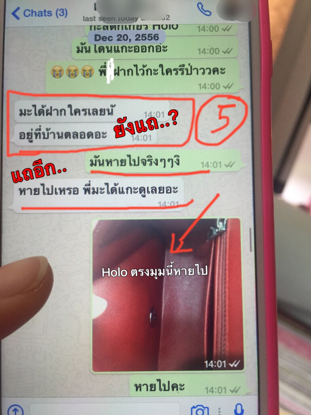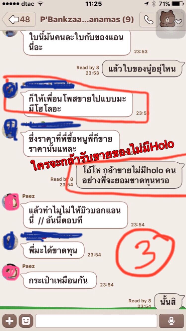 -ต่อนะคะ พอเราสอบถามพี่ร. ไป ว่ากระเป๋าเราไปเสนอขายให้พี่บ. ใช่มั้ย? พี่ร. ตอบกลับมาว่า ไม่ใช่ คนละใบนะ โดยที่บอกเราว่า ให้เรากลับไปหารูปเก่าที่มีHolo จะได้รู้ว่ามันคนละใบ (ก็แหง่แล่ะ ก็พี่เล่นสลับHoloกันแล้วนิ อันนี้คิดในใจ55+) จากนั้นพวกพี่ๆในกรุ๊ป ก็ช่วยถาม ช่วยบี้ พี่ร. ว่ากระเป๋าของเรา เอาไปขายให้ใครต่อ?! (ตรงนี้นางสมองเสื่อมขึ้นมาทันที บอกจำไม่ได้ หึหึ) พี่ร. ได้แต่บอกว่า ฝากเพื่อนหลายคนไปโพสขาย อ่าว! แต่ใครขายให้พี่ร. ได้ พี่ร.ก็ต้องจำได้บ้างล่ะ กระเป๋าแบรนเนมนะ ไม่ใช่199 ที่จะไม่จดไม่จำอะไรเลย!!