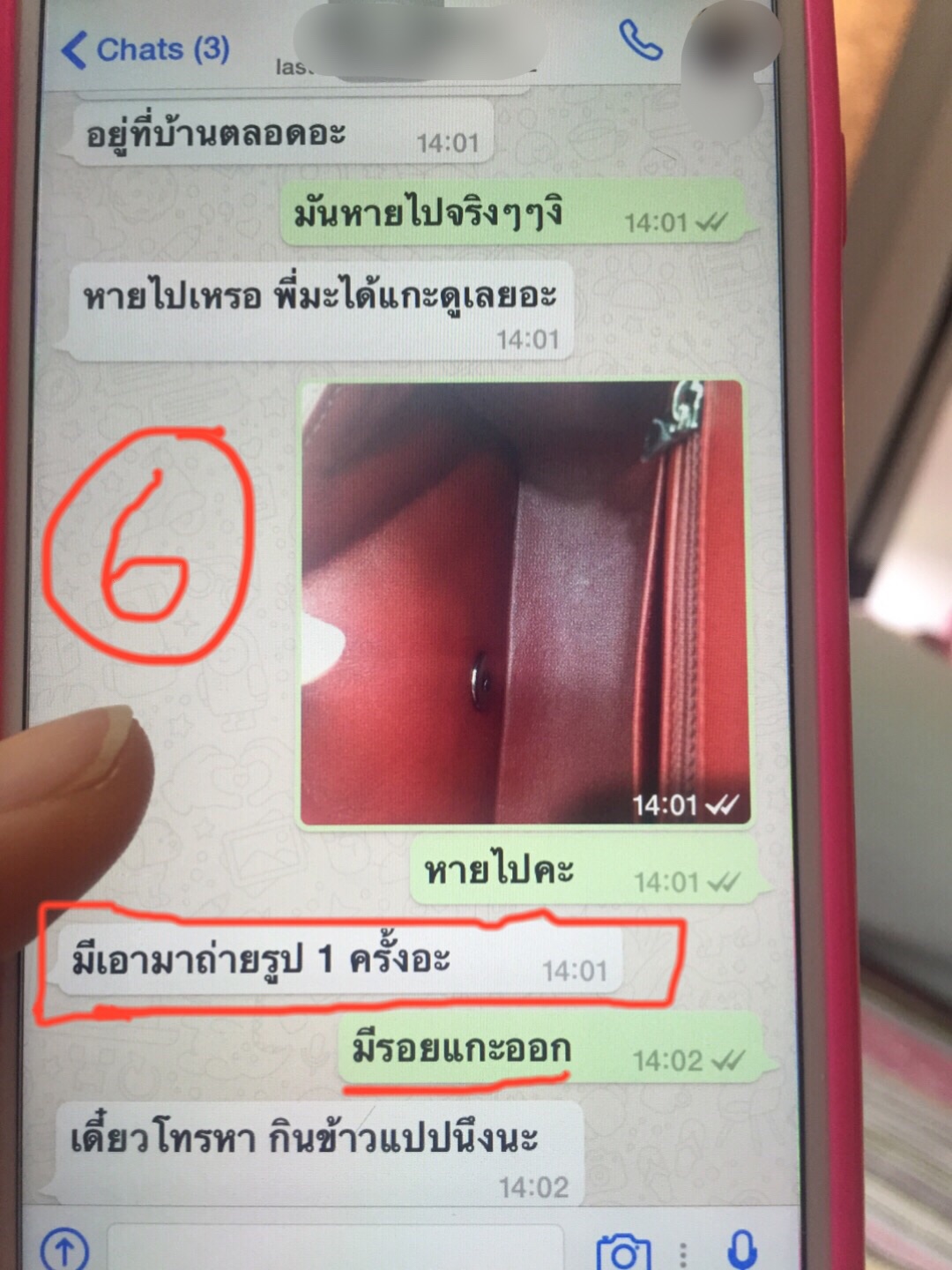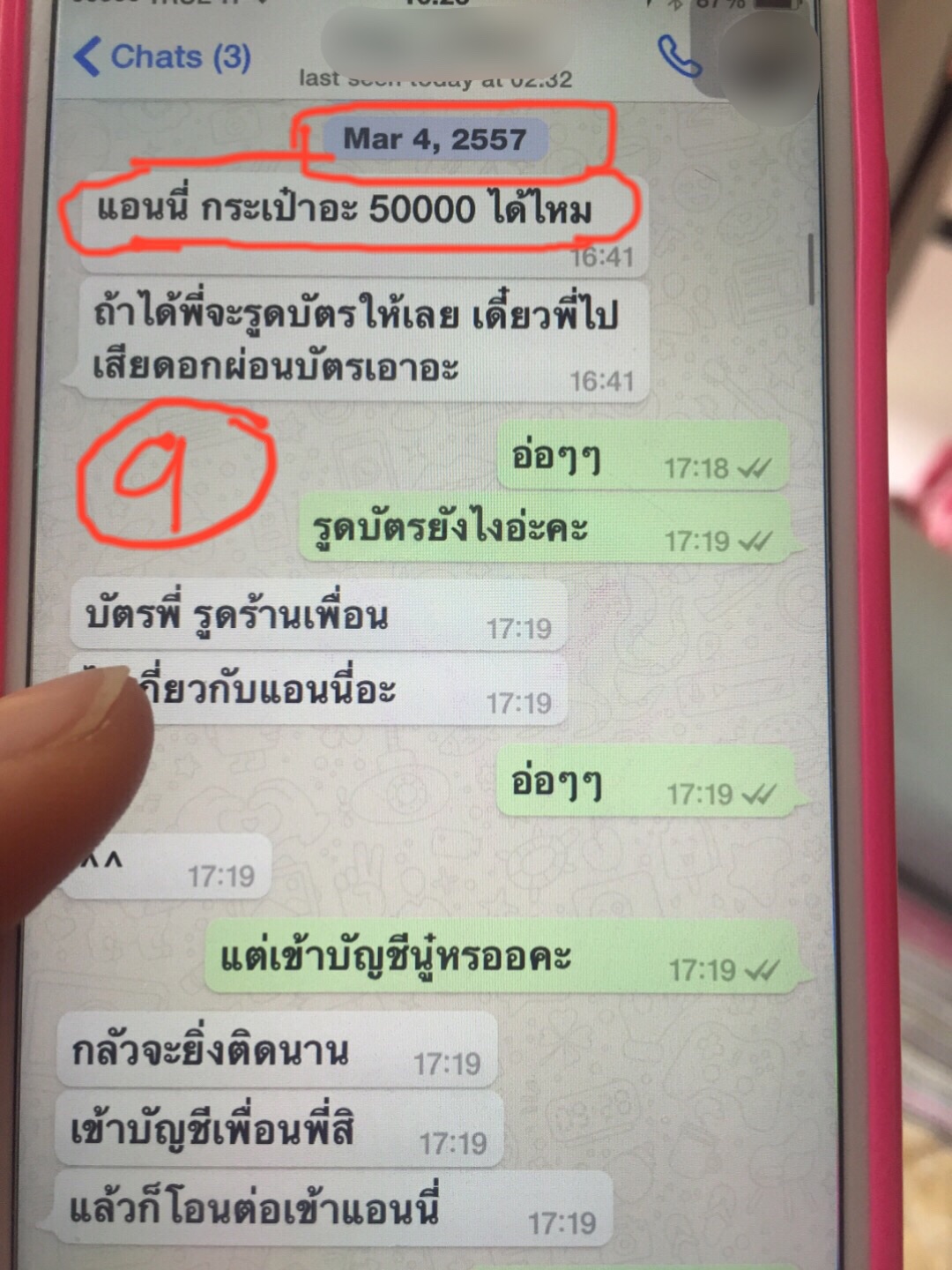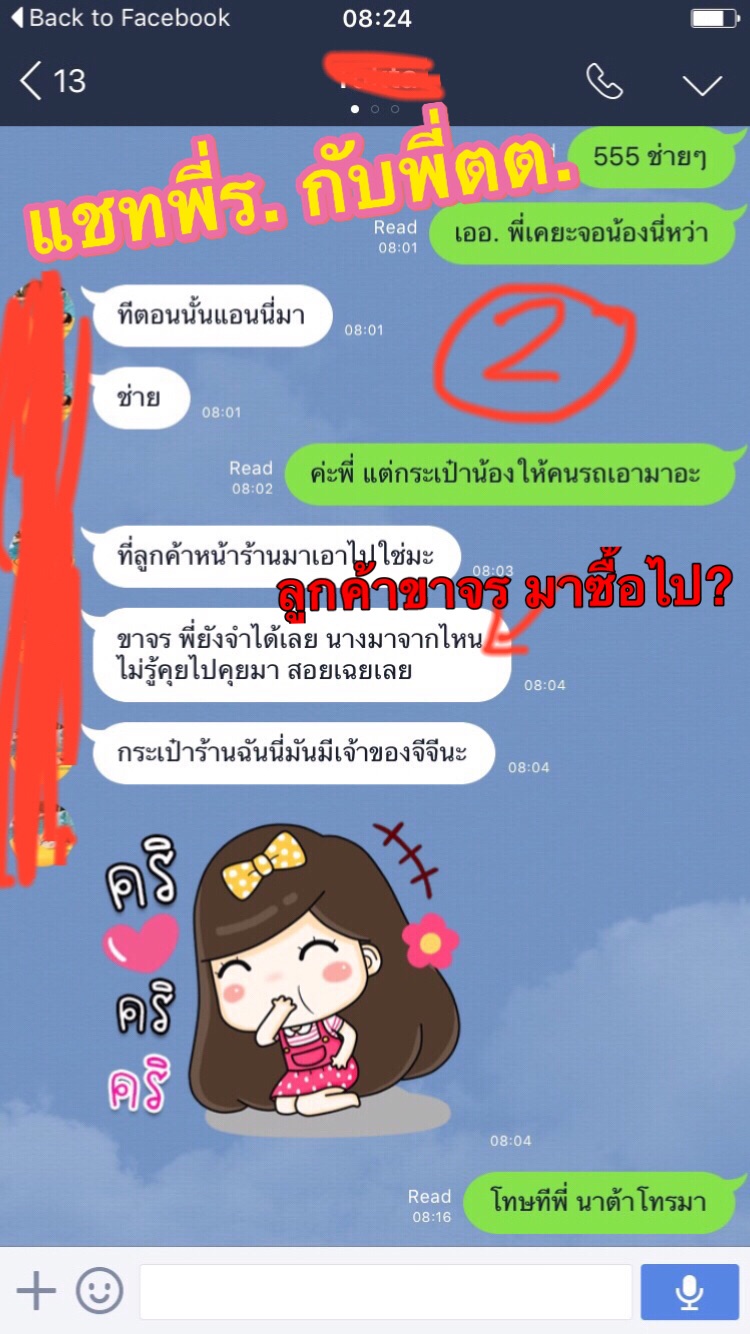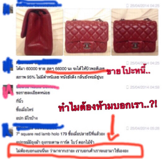 -สรุป เราก็ให้เวลาพี่ร. ไปหาหลักฐานมา ว่ากระเป๋าของเราได้นำไปขายต่อให้ใคร จากนั้นนางก็กลับมาพร้อมตัวละครอีกคน ชื่อพี่ ตต. เป็นเจ้าของร้านขายของแถววังหลัง (เราก็แอบคิดในใจ แหม!!ทีตอนแรกจำไม่ได้ ทีตอนนี้ลากตัวละครเข้ามา) พี่ร. ส่งแชทที่ได้คุยกับพี่ ตต เข้ามาที่กรุ๊ป โดยแชทของพี่ร.และพี่ตต. มีใจความว่า กระเป๋าของเราได้ขายไปให้กับลูกค้าขาจร ในราคา5หมื่น โดยที่ไม่มีการ์ดและHolo ตึ่ง!!!! ลูกค้าขาจร มาซื้อกระเป๋าChanel ราคา5หมื่น ??? เฮ้ย!! คนเราจะซื้อแบรนเนมที มันต้องคิดมาก่อนสักอาทิตย์ว่าอยากได้ใบนี้ กระเป๋าราคาไม่ใช่ถูกๆ ไม่ใช่ใบละ199 ที่จะซื้อปุ๊บปั๊บ !! แล้วราคา5หมื่นเนี่ย!!! อปก.ก็ไม่ครบ ยิ่งไม่มีการ์ดกับHoloด้วย!? บ้าไปแล้วว!!! (ต่อให้ราคาถูกกว่านี้ สัก3หมื่น เรายังไม่กล้าซื้อเลย!!)