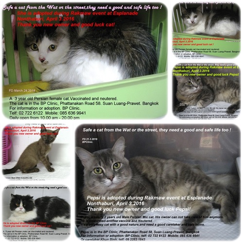The 4 cats on the attached pictures are adopted,3 during the last Rakmaw cat event at Esplanade in Nonthaburi