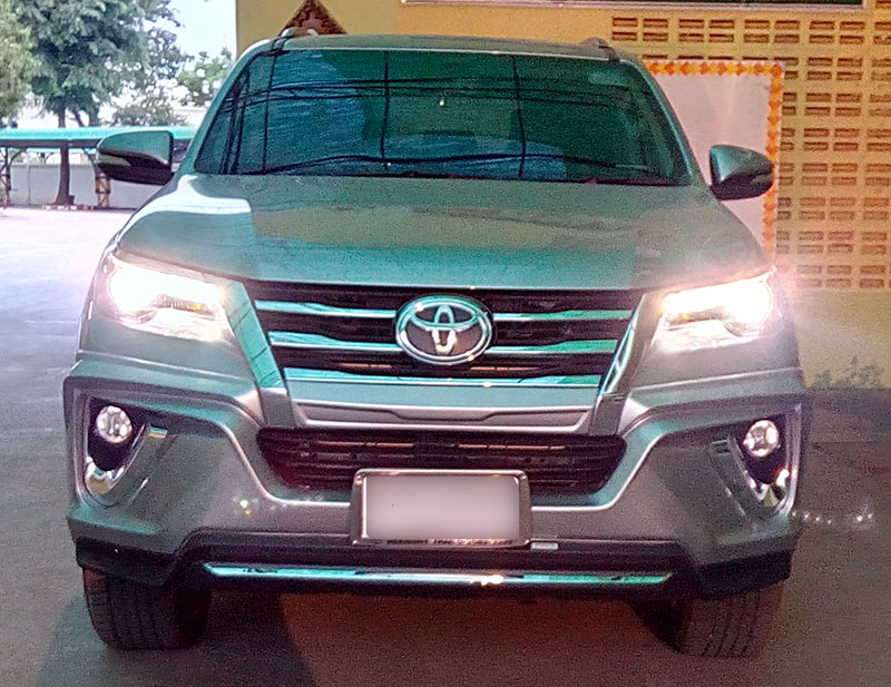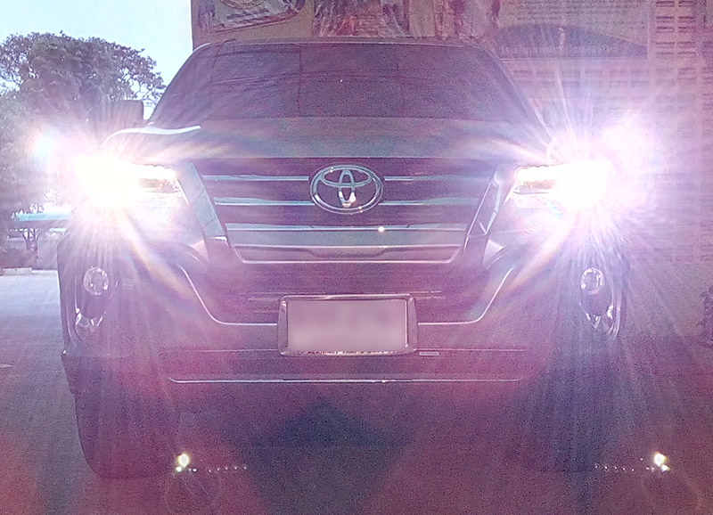 พอดีอยู่บริเวณลานจอดรถกว้าง ๆ และมีเวลาว่างในช่วงโพล้เพล้ ประมาณ 18.30 น. ก็เลยได้โอกาสถ่ายรูปไฟหน้ารถฟอร์จูนเนอร์ 2015 ที่เป็นแบบ LED (จากเดิมผมปรับให้ต่ำกว่าปกติจากโรงงาน ตอนถ่ายรูปก็เอามาปรับให้เท่ากับโรงงาน) ถ้ามองจากมุมคนขับ ก็จะเห็นเส้นคัทออฟคมกริบ แล้วก็ออกมายืนหน้ารถ ระยะห่างประมาณ 3 เมตร ถ่ายสามรูป คือ 1.ระดับสายตา 2.ระดับลิ้นปี่ 3. ระดับเอว ลองพิจารณาดูนะครับ