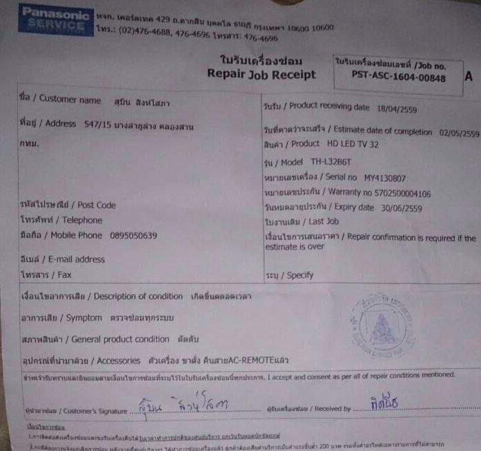 Tv panasonic ซ่อมนานไหมครับ เลขที่ใบแจ้งซ่อมpst-asc-1604-00848