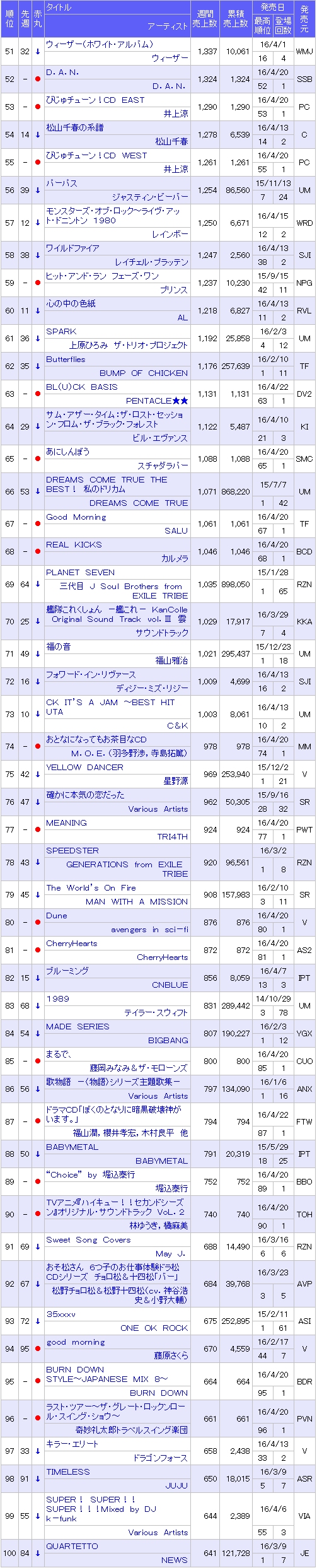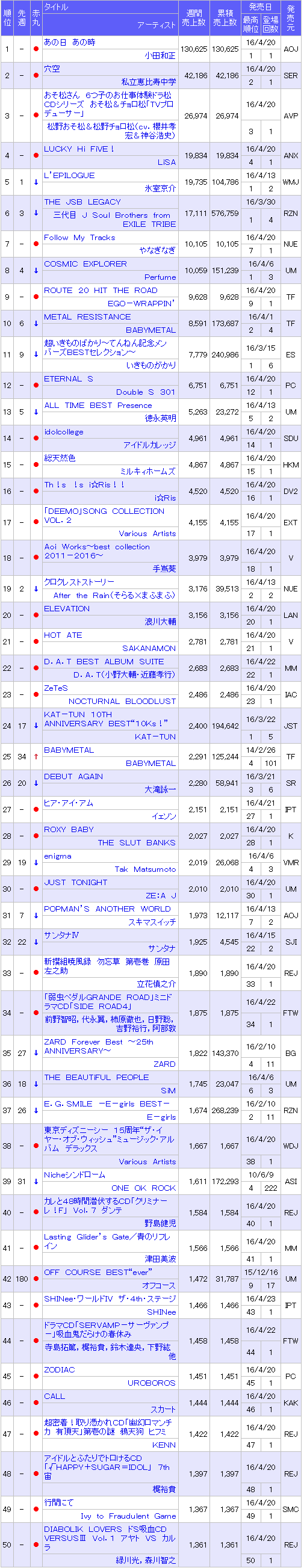 นักร้องนักแต่งเพลงและอดึตสมาชิกวง Off Course วงดนตรีตำนานวงการดนตรีญี่ปุ่น Oda Kazumasa [68] วางขายอัลบั้มพิเศษฉลองครบรอบ 30 ปีที่เดบิ้วส์เป็นศิลปินเดี่ยว กับอัลบั้ม 『Ano Hi Ano Toki』 (วางขายวันที่ 20 เมษายนที่ผ่านมา) ขายไปได้ 130,625 แผ่น ในสัปดาห์แรกขึ้นสู่อันดับ 1 ของโอริคอนชาร์ทอัลบั้มรายสัปดาห์ เป็นอัลบั้มอันดับ 1 ครั้งที่ 10