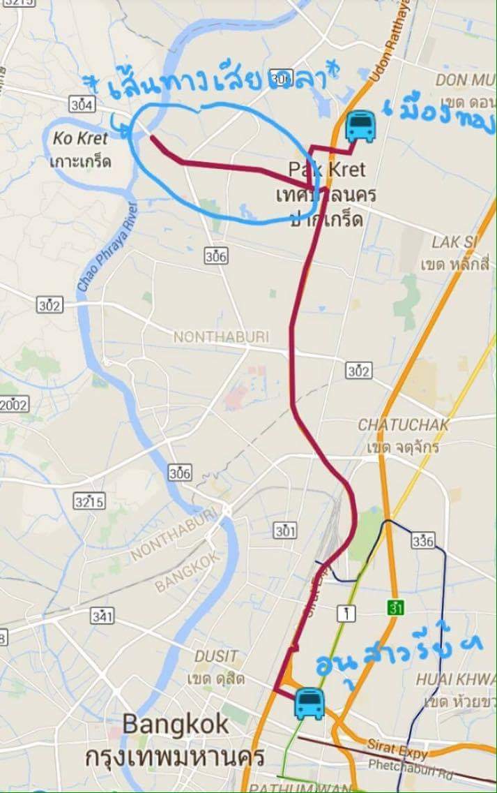 ตรงจุดที่วงกลมไว้ว่าเป็นเส้นทางเสียเวลา เพราะรถจะไปวนเข้าที่ปากเกร็ดก่อน ถึงจะวนกลับมาที่เมืองทอง ดังนั้นกระเป๋ารถเมล์เลยแนะนำให้เรา