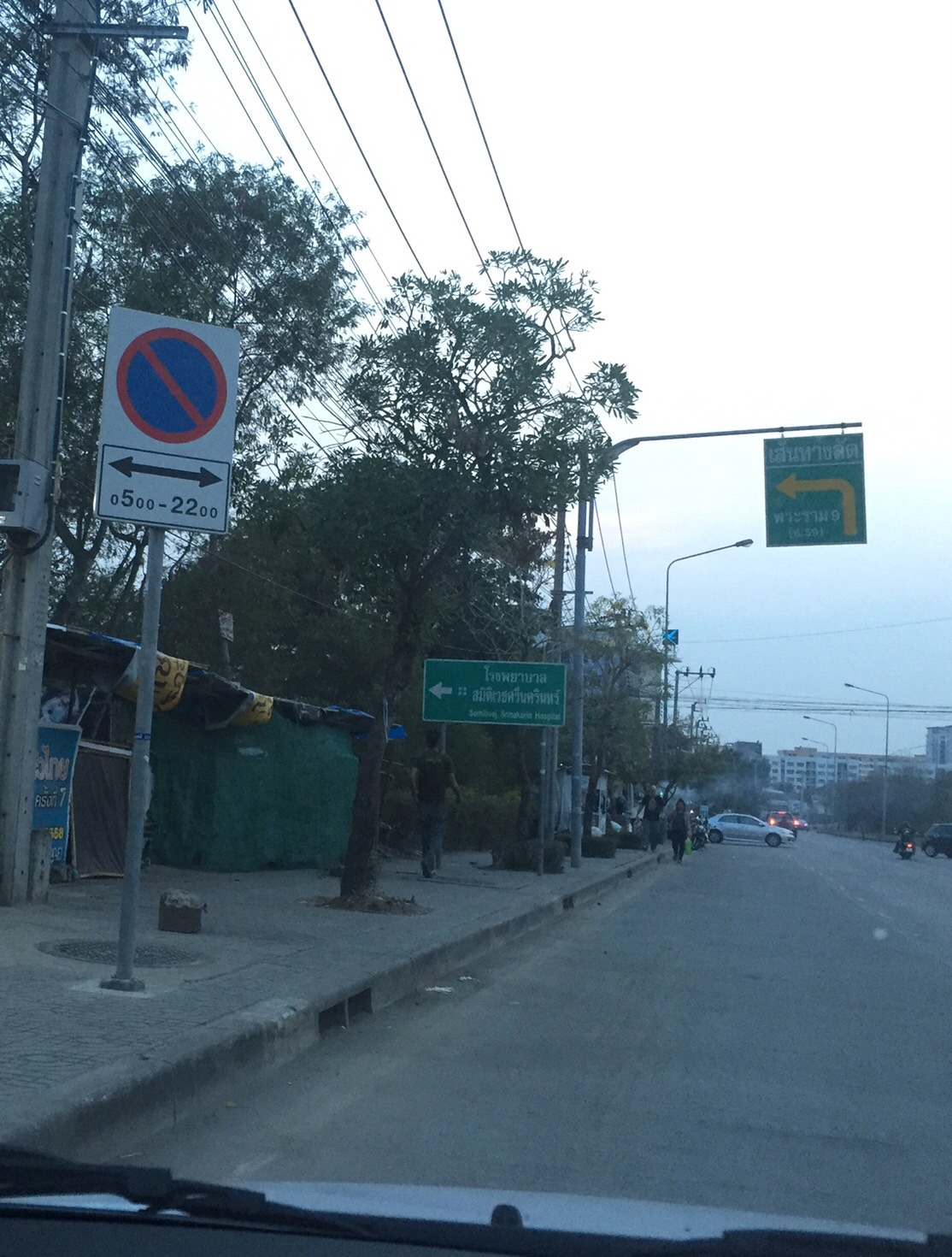 มองไปที่ป้ายริมถนนแจ้งว่าห้ามจอดริมถนนบริเวณนี้ตั้งแต่เวลา 05.00-22.00 ((ตามรูปการณ์คือเราผิด ยังไงต้องยอมเสียค่าปรับ))