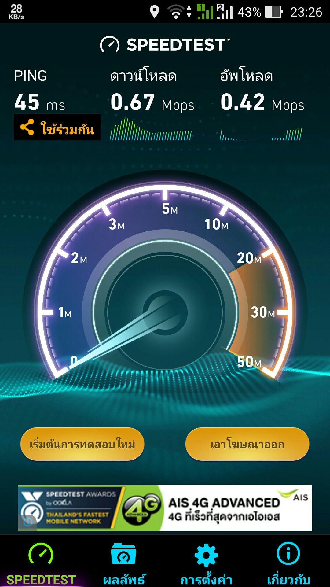 ผมได้มีการทดสอบแล้ว จนมั่นใจว่าเป็นที่อุปกรณ์ router ของ ais ที่แถมมา กระจายสัญญาน ไวไฟ ไม่ดี สองวันแรก เทสได้ไม่เกิน 20 m