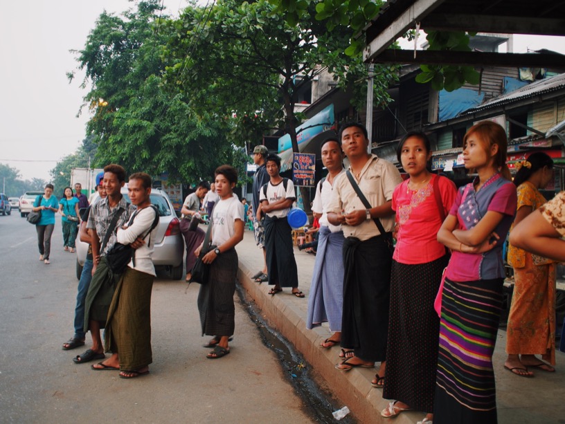 ถึงแล้วค่ะ ตลาด 10 ไมล์สต๊อป พอลงจากรถ ก็งงสิคะ ไปไม่ถูก ไม่รู้ต้องไปขึ้นรถเมล์ตรงไหน คนพลุกพล่านมากๆ ตัดสินใจถามคนแถวนั้นเลยค่ะ เลือกถามคนที่วัยรุ่นหน่อย น่าจะพูดภาษาอังกฤษได้ แล้วก็ไม่ผิดหวังค่ะ นักศึกษาหนุ่มชื่อ Pyee Phyo พาข้ามถนนและเดินไปป้ายรถเมล์ การข้ามถนนที่พม่านี่ต้องใช้ความสามารถทางด้านความเร็วค่อนข้างมากนะคะ เพราะคนพม่าไม่ชะลอรถค่ะ ต้องหาจังหวะดีๆ 55