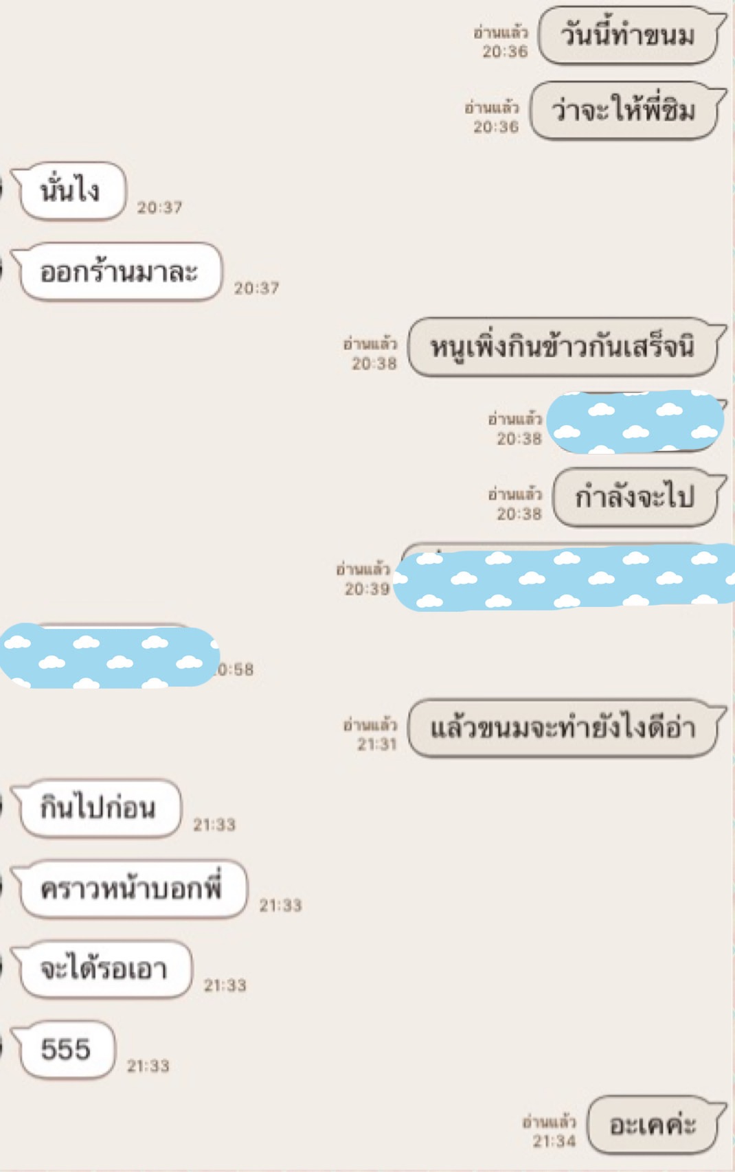 กว่าเราจะทำขนมเสร็จ กว่าจะเก็บอุปกรณ์เสร็จก็เกือบทุ่มนึง. พวกเรารีบออกไปหาอะไรกินรองท้องก่อนไปที่ร้านที่นัดเค้าไว้ ประมาณสองทุ่ม เค้าส่งไลน์มาบอกเราว่า " วันนี้ไม่ได้เข้าไปที่ร้านแล้วนะ เค้าเปลี่ยนแผนนิดหน่อย " อ่านเสร็จเราก็อึ้งไปสามวิ แล้วก็บอกเค้าว่าเรากำลังจะเข้าไปที่ร้านที่นัดแล้วนะ
