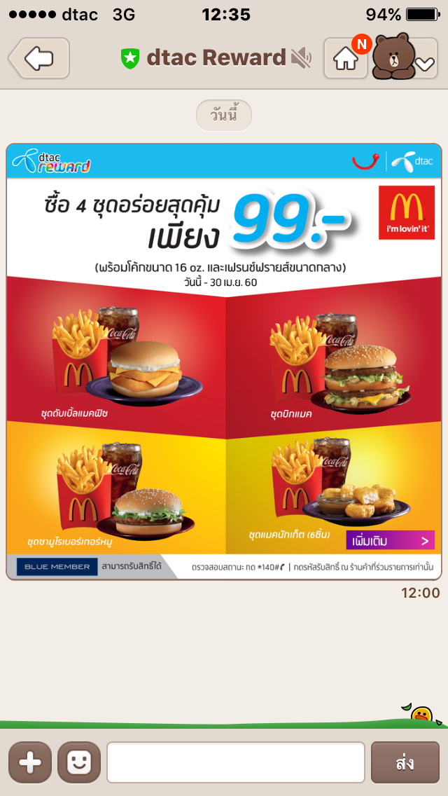 พอดีได้รับข้อความใน Line ว่ามีโปรนี้ตอนเที่ยง เลยเดินฝ่าแสงอัลตร้าไวโอเลตแบบเข้มข้น จนสะเทีอนไปทุกรูขุมขน ไปร้าน M เวลา12.30 โดยประมาณ ยื่นโปรให้ พนงดู ลองกดเบอร์ตามที่ในLine แจ้งมาก็เป็นการเช็คเบอร์เฉยๆ ถามพนง ก็ไม่มีรหัส เอารหัสเก่ามาให้กดแล้วบอกว่าหมดโปรแล้ว ผมเลยบอกว่าที่เอามาให้กดมันรหัสเก่าหมดตั้งแต่12เมษา น้องบอกใช่พร่หมดแล้ว....เดี๋ยวนะมันใช่เหรอ อันที่เพิ่งส่งไลน์มาตอนเที่ยงบอกหมด 30 เมษา60 แล้วก็มีเสียงสวรรค์ บอกว่า พี่สิทธิ์ เต็มแล้ว ไว้กดใหม่พรุ่งนี้..... เลยอยากรู้ว่า มีใครได้ทานโปรนี้ไหมครับ แค่ครึ่ง ชม ก็เต็มซะแล้ว อยากจะบอกว่า ...เอาหนังกำพร้าที่ถูกแดดแผดเผาไปทุกอณูคืนผมมาาาาาา 555