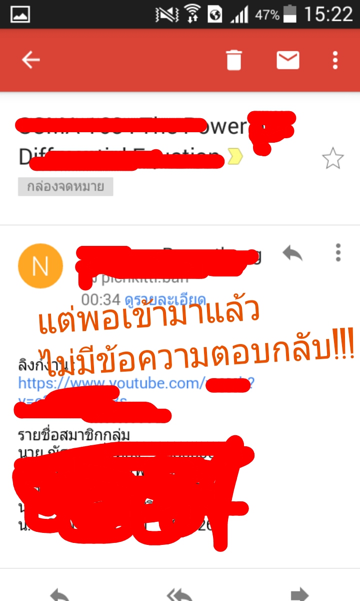 เมื่อวานผมส่งงานให้อาจารย์ทาง Gmail แล้ว อาจารย์ก็เลยตอบกลับว่าได้งานแล้ว แต่ปัญหาคือ ผมเปิดข้อความที่ อ.ส่งมาใน App ไม่ได้ ต้องทำไงครับ