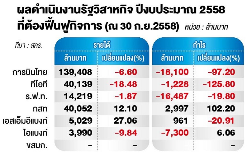 อีกแห่งคือ เอสเอ็มอีแบงก์ มีกำไรงวด 9 เดือนของปี 2558 อยู่ที่ 961 ล้านบาท แต่ยังลดลงเมื่อเทียบกับช่วงเดียวกันของปีก่อนอยู่ 20.91% แต่มีรายได้เพิ่มขึ้น โดยมีรายได้ 5.02 พันล้านบาท เพิ่มขึ้น 27.06% จากช่วงเดียวกันของปีก่อน ส่วนรัฐวิสาหกิจอื่น ยังมีผลขาดทุนอยู่ โดยการบินไทยขาดทุนสุทธิ 1.8 หมื่น ล้านบาท รฟท.ขาดทุน 1.6 หมื่นล้านบาท ไอแบงก์ขาดทุน 7.3 พันล้านบาท และทีโอทีขาดทุน 1.22 พันล้านบาท