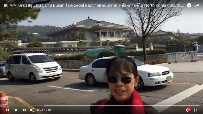 ทำเนียบประธานาธิบดี อยู่หลังวัง แต่ต้องอ้อมไปอีกด้าน สร้างหันหลังให้ภูเขามังกร ซึ่งเป็นสัญลักษณ์แห่งอำนาจเช่นกัน ชื่อว่า Cheongwadae Darangchae เป็นที่รูจักกันในชื่อ Blue House เราต้องเดินลงไปใต้ดินแล้วขึ้นทางออกที่ 3 เป็นอีกด้านของมุมถนน เดินมุ่งหน้าไปยังภูเขามังกรผ่านโบสถ์ Cheongya Pope Church มีคนออกมาต้อนรับเชื้อเชิญเราเข้าไปในโบสถ์ และช่วยเราถ่ายภาพคู่