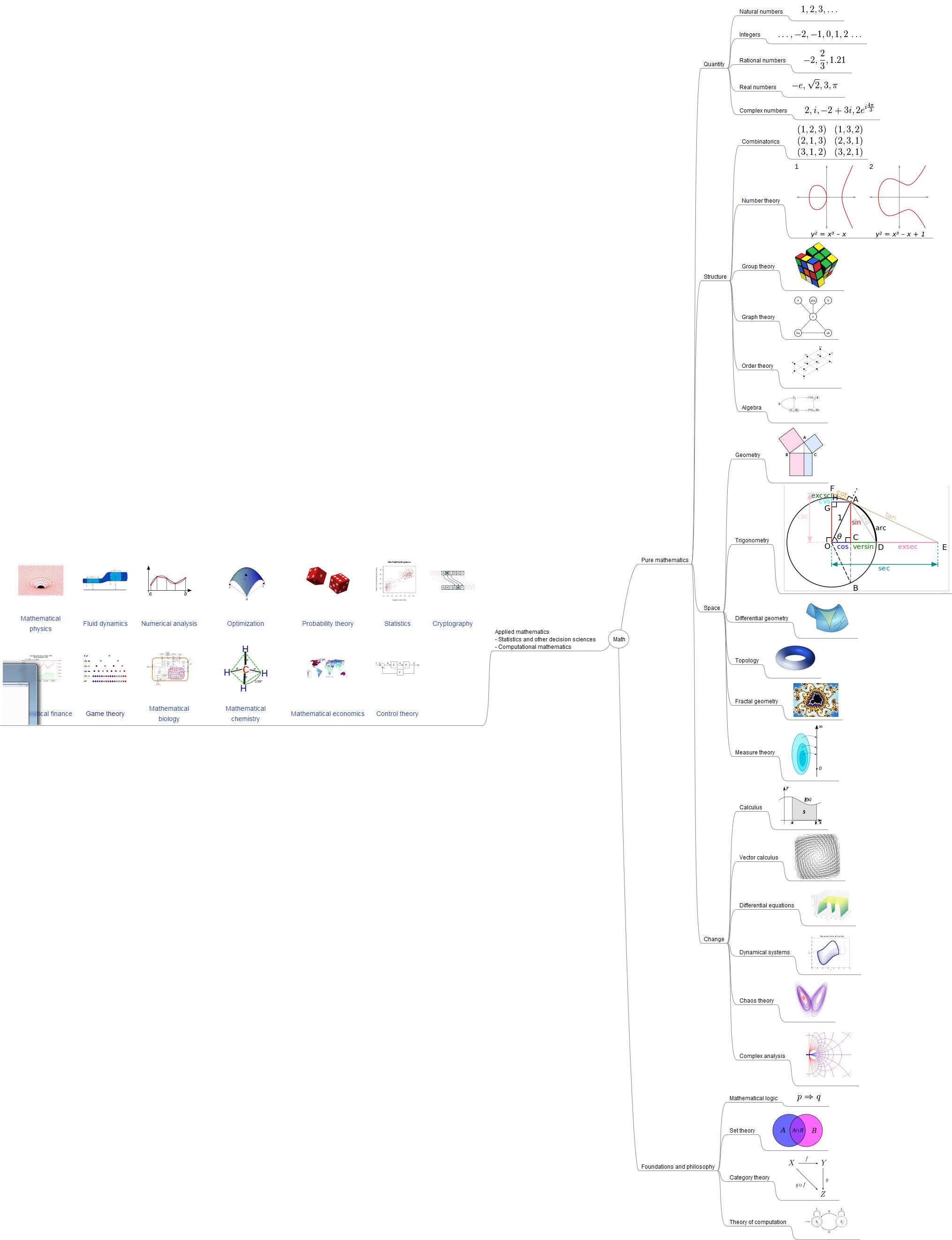 ส่วนรูปภาพต่อไปนี้ ผมได้ลองรวบรวมหัวข้อวิชาคณิตศาสตร์จากวิกิ เพื่อทำความเข้าใจรูปแบบของวิชาในคณิตศาสตร์ในภาพรวม พื่อจะได้ให้ตัวเองเข้าใจโครงสร้างของคณิตศาสตร์ก่อน