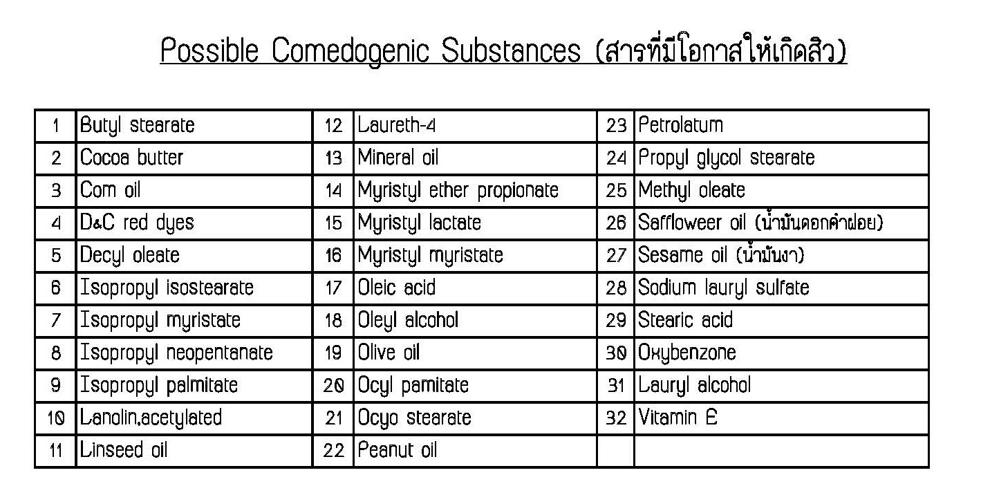 ซึ่งสารในตารางเหล่านี้เป็นสารที่ทำให้เกิดสิวได้ หากพบว่าผลิตภัณฑ์ต่างๆที่ซื้อมีส่วนผสม