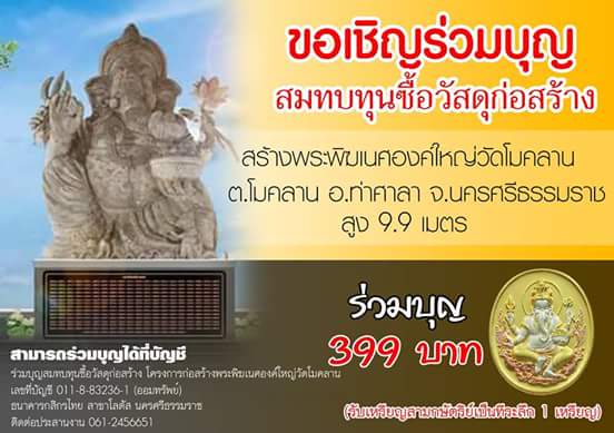 ขอเชิญร่วมบุญสมทบทุนซื้อวัสดุอุปกรณ์ก่อสร้าง โครงการก่อสร้างพระพิฆเนศองค์ใหญ่ วัดโมคลาน สูง 9.9 เมตร ชุดละ 399 บาท (จะมีเหรียญสามกษัตริย์ มอบให้เป็นที่ระลึก 1 เหรียญ)