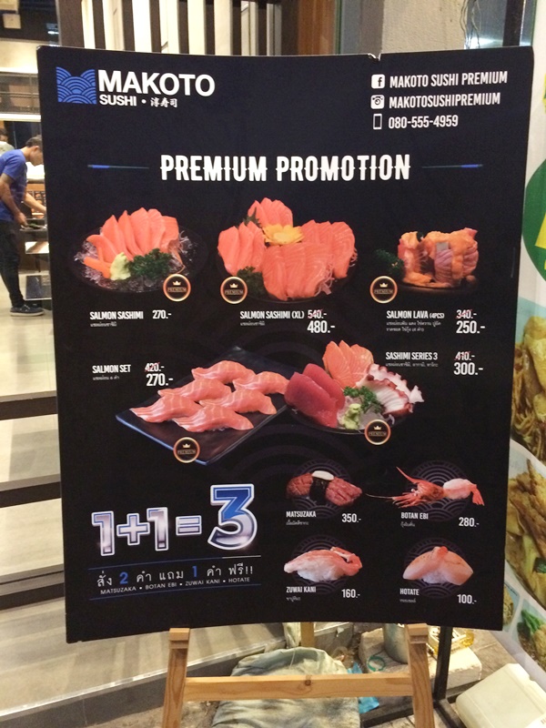 นั่นไงป้ายโปรโมชั่นจริงๆ เป็นร้านซูชิ ชื่อ Makoto Sushi Premium พอเห็นป้ายโปรโมชั่นเท่านั้นแล่ะ ไม่มีการลังเลจูงมือเพื่อนสาวเดินเข้าร้านทันที ลืมไปซะสนิทว่าเราตั้งใจมากินขนมหวานกันไม่ใช่หรอ 55 เอาน่าถือซะว่ากินมื้อเย็นไง ค่อยไปหาของหวานปิดท้ายก็ได้