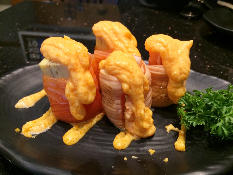 แซลมอนพันแตงกวา ไข่หวาน และปูอัด ราดด้วยซอสไข่กุ้ง คำใหญ่แบบอ้าปากจนเห็นลิ้นไก่ก็ยัดเข้าไปไม่หมด 55 หรือถ้าใครคิดว่าปากกว้างระดับสุดก็ยัดเต็มที่เลย เพราะถ้ากินได้ภายในคำเดียวมันจะฟินมากแต่คงอยากอ่ะ เพราะชิ้นมันใหญ่จริง แซลมอนที่พันจะมี 2 แบบ คือเป็นแซลมอนดิบกับแซลมอนสุก ส่วนตัว จขกท.ชอบแบบที่พันด้วยแซลมอนสุกมากกว่าเพราะเนื้อแซลมอนนุ่มตัดกับแตงกวากรอบๆ และไข่หวานกับปูอัด ที่สำคัญคือซอสไข่กุ้งเข้มข้นอร่อยจนอยากจะกวาดซอสให้หมดจาน