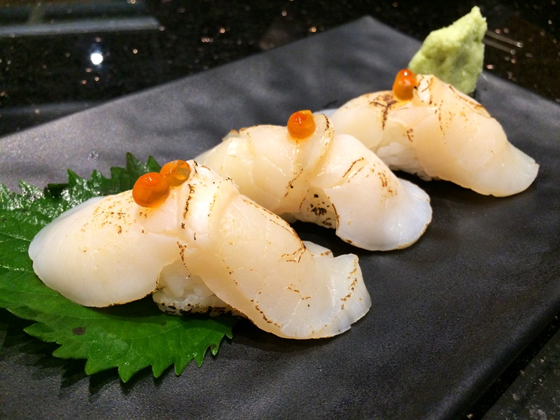 ซูชิหน้าหอยเชลล์กริลล์นิดๆ มีไข่ปลากระจุ๋มกระจิ๋มวางด้านบน จขกท.คิดว่าน่าจะมีไข่ปลาเยอะกว่านี้แต่เดี๋ยวนะนี่เน้นหอยเชลล์ไม่ใช่ไข่ปลา แอบโลภนะคะ 55 หอยเชลล์เนื้อดึ๋งมีกลิ่นหอมไหม้นิดๆ จากการกริลล์ ไม่รู้ว่าข้าวปั้นมันคำเล็กไปหรือหอยชิ้นใหญ่ไปพอกินแล้วรู้สึกว่ามันไม่ค่อยพอดีแบบว่าข้าวหมดละหอยยังเต็มปากอยู่เลย มันก็ดีแล้วป่ะจะได้กินหอยแบบเต็มคำ