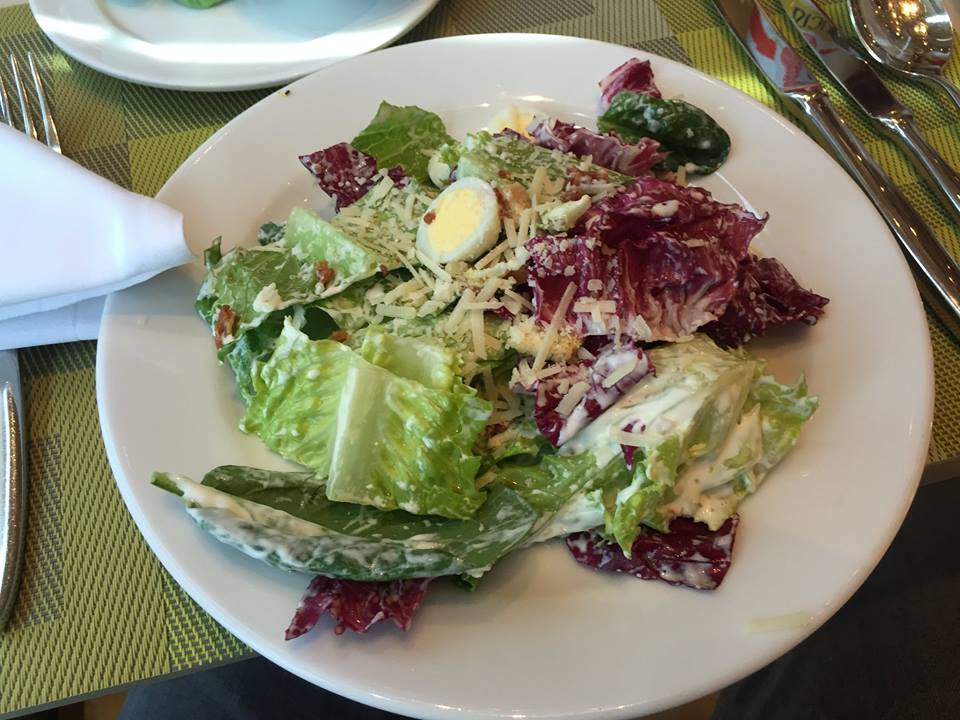 จัดก่อนกับโซนโต๊ะกลาง ซึ่งเป็นโซนที่เน้นผัก ผลไม้ cold cut และชีส โดยเริ่มจากสลัด Caesar salad รสชาติธรรมดา ไม่มีอะไรพิเศษ