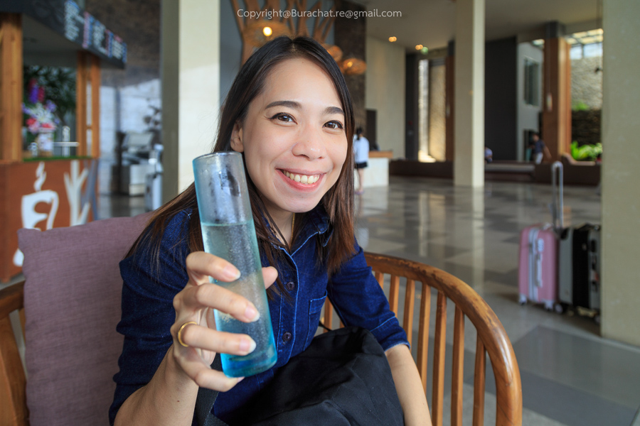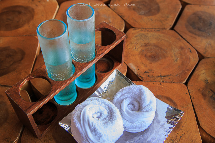 มาถึงปุ๊บคุณพนักงานก็นำน้ำใบเตยใส่แก้วเก๋ ๆ ทรงกระบอกเย็นชื่นใจมาให้ทาน พร้อมผ้าเย็นสำหรับไว้เช็ดหน้า