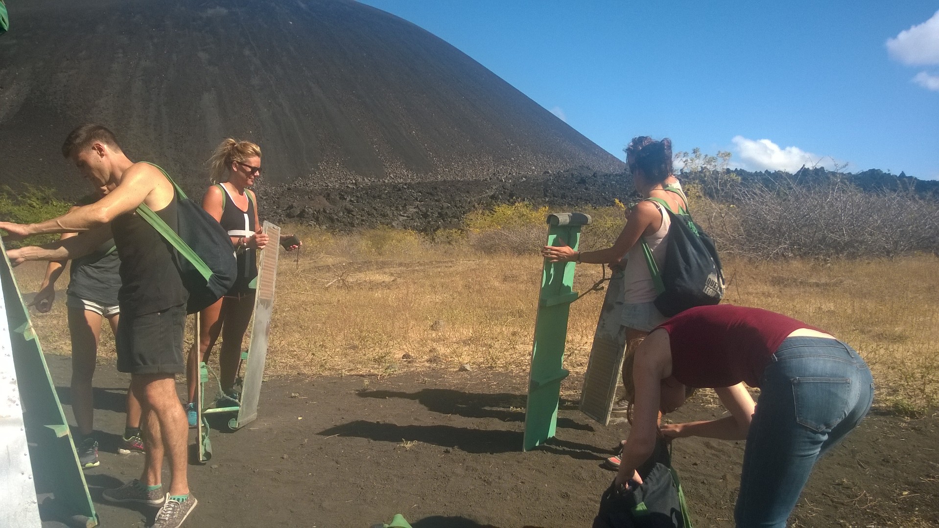 ตอนนั้นอยู่ที่เมือง Leon ต้องนั่งรถกันออกไปนอกเมืองประมาณครึ่งชั่วโมง หนทางค่อนข้างสมบุกสมบัน ทั้งฝุ่น ทั้งกระแทกกึกๆๆ เมื่อไปถึงก็ได้รับแจกอุปกรณ์ ตั้งแต่แว่นตากันฝุ่น ชุดหมีกันเจ็บ และกระดานไม้ค่อนข้างหนักเอาไว้นั่งไถลลงมา เสร็จแล้วได้เวลาเดินขึ้นภูเขาไฟ..
