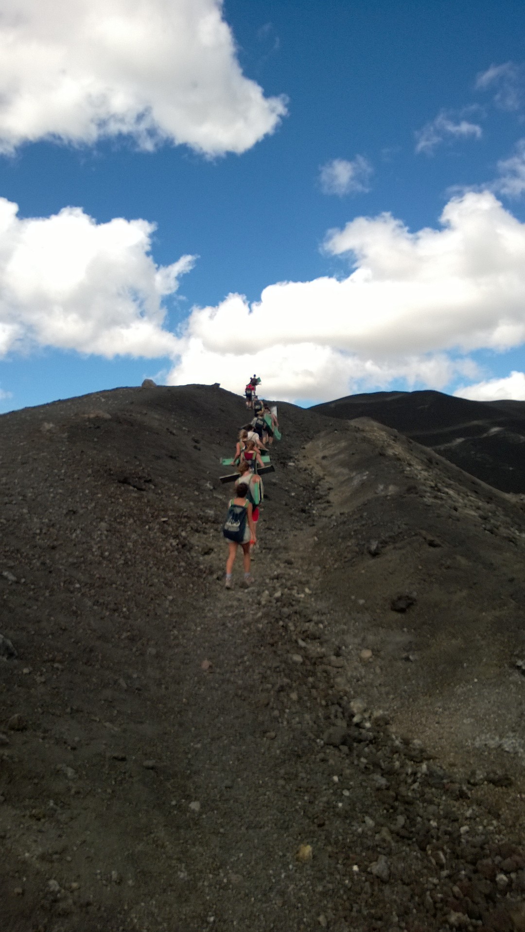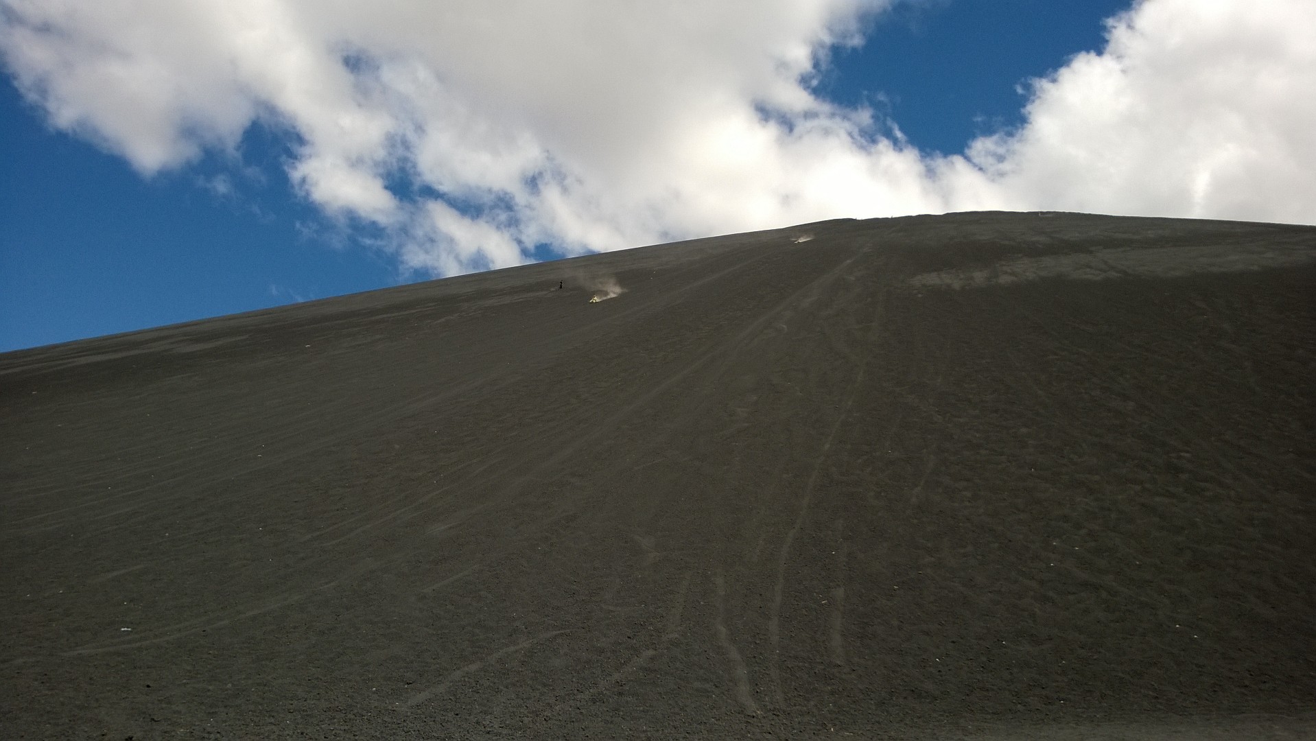 ถึงยอดมองลงไปตรงที่จะต้องสไลด์ไม้กระดานลงจากภูเขาไฟ ใจมันตุ้มๆต่อมๆบอกไม่ถูก มันสูงและชัน และมันก็..ภูเขาไฟ รอดูเชิงเพื่อนๆฝรั่งใจกล้าทุกคน เอ้อ.. มันไม่ยาก เขาเล่นดูสนุกกันทุกคน พอถึงตาเรา เราก็หายใจเข้าลึกๆ ทำใจให้สบาย ใส่ชุดหมีและแว่นตา เสร็จแล้วลงนั่งบนกระดานและ สาม สอง หนึ่ง ไป!! ฟิ้วววว… มันแร๊งงงงง ถึกๆ ถืกกก...ก และก็รถคว่ำกลางทางอย่างช่วยไม่ได้ แต่นั่นทำให้รู้ว่าภูเขาไฟลูกนี้ไม่น่ากลัวอีกต่อไป เรานี่คว่ำอยู่สามครั้งเป็นอย่างต่ำ แต่ไม่มีรอยแผลใดๆ แต่นั่นอาจเป็นเพราะความโชคดีของเราเองด้วย เพราะเห็นบางคนถลอกจนเลือดออกหน้าแข้งก็มี