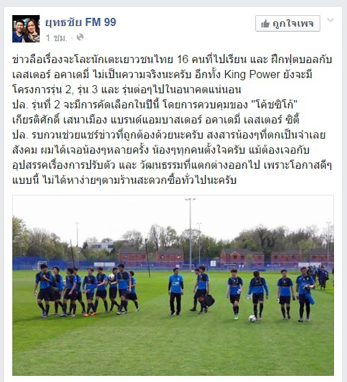 เนื่องจากตอนนี้ได้มีหลายๆเพจที่เกี่ยวกับฟุตบอลนำข่าวเกี่ยวกับน้องๆข่าวนี้ไปใส่สีตีไข่เพิ่มเติม กลายเป็นว่าน้องๆโดนเลสเตอร์สั่งปลดไปแล้ว ผมขอแก้ข่าวให้น้องๆจากโพสของ คุณ ยุทธชัย FM 99 ตามนี้นะครับ