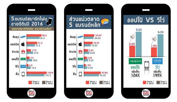 ไม่ว่าใครจะอยู่หรือใครจะไป แต่แบรนด์อันดับ 1 ในตลาดสมาร์ทโฟนยังเป็นซัมซุง (Samsung) ซึ่งมียอดจำหน่าย และส่วนแบ่งตลาดเทียบเท่าปีก่อนหน้า นำโด่งเมื่อเทียบกับอันดับ 2 คือ แอปเปิล (Apple) ที่ยอดจำหน่ายหายไปนับ 10 ล้านเครื่อง