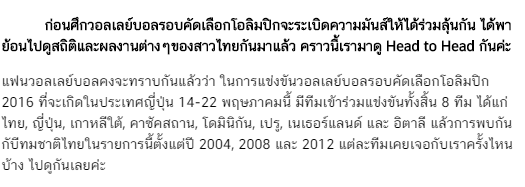 ส่วนตัว ค่อนข้างมั่นใจนะว่าโอลิมปิคคราวนี้ สาวไทยจะได้ไปเฉิดฉายที่ ริโอ แน่ๆ พอได้เห็นทีม ที่จะมาร่วมคัดกับเราแล้ว มีลุ้น...(ไม่ไกลเกินฝัน) เราว่านะ เผลอๆ ทีมจาก เอเชีย จะได้ไป 3 ทีม เลยด้วยว้ำ อิอิ