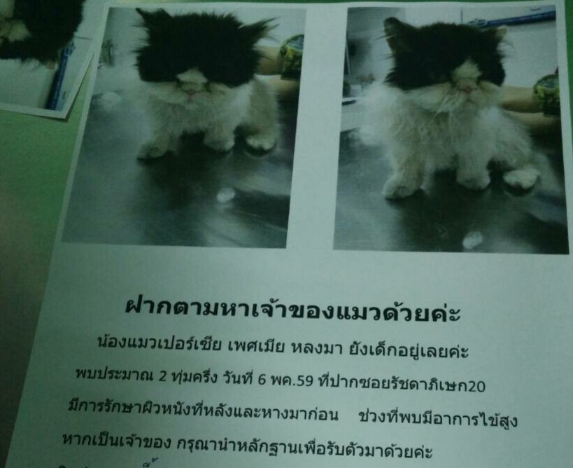 เพื่อนผมพบแมว (คาดว่าเป็นแมวเปอร์เซีย) ท่าทางยังเด็กอยู่ หลงมาสถาพมีไข้ เพื่อนผมเลยพาแมวไปรักษา ถ้าแมวใครหาย สามารถติดต่อไปยังคลีนิคที่รักษาได้เลย หรือหลังไม์มาได้ครับ