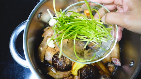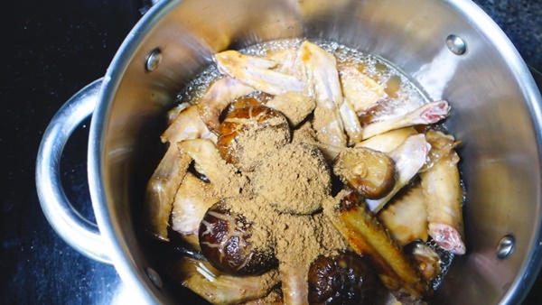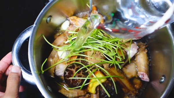 นำเห็ดหอมแช่น้ำให้นิ่ม แล้วเราก็เอาเห็ดหอมมาใส่ในหม้อตุ๋น พร้อมน้ำที่แช่เห็ดหอมค่ะ