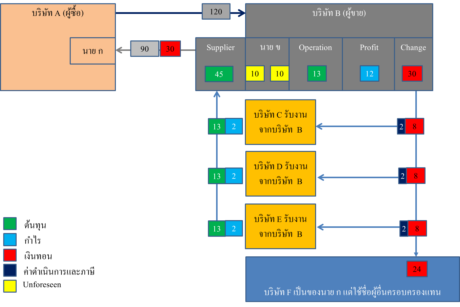 เมื่อบริษัท B ได้งาน บริษัท B ก็จะทำงานส่วนที่หนึ่งของตัวเอง และเปิดใบสั่งซื้อส่วนที่สอง สาม และ สี่ ให้บริษัท C D และ E ทำตามลำดับ แต่แทนที่จะสั่งซื้อตามราคาที่ C D E เสนอมาที่ 15 บาท บริษัท B กลับสั่งซื้อ C D E ในราคา 15 +10 = 25 บาท ส่วนต่าง 10 บาทที่เกินไปนั้น ให้บริษัท C D และ E ไปสั่งซื้ออะไรก็ได้จากบริษัท F (น่าจะเป็นการสั่งซื้อบริการประเภทการจัดอีเว้นท์ หรือการอบรมอะไรบางอย่าง) ซึ่งบริษัท F นั้นเป็นของนาย ก.