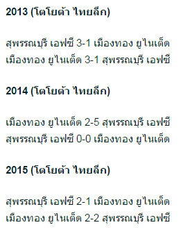 ในการพบกันทั้งหมด 6 นัด สุพรรณ ชนะ 3 เสมอ 2 และแพ้ 1