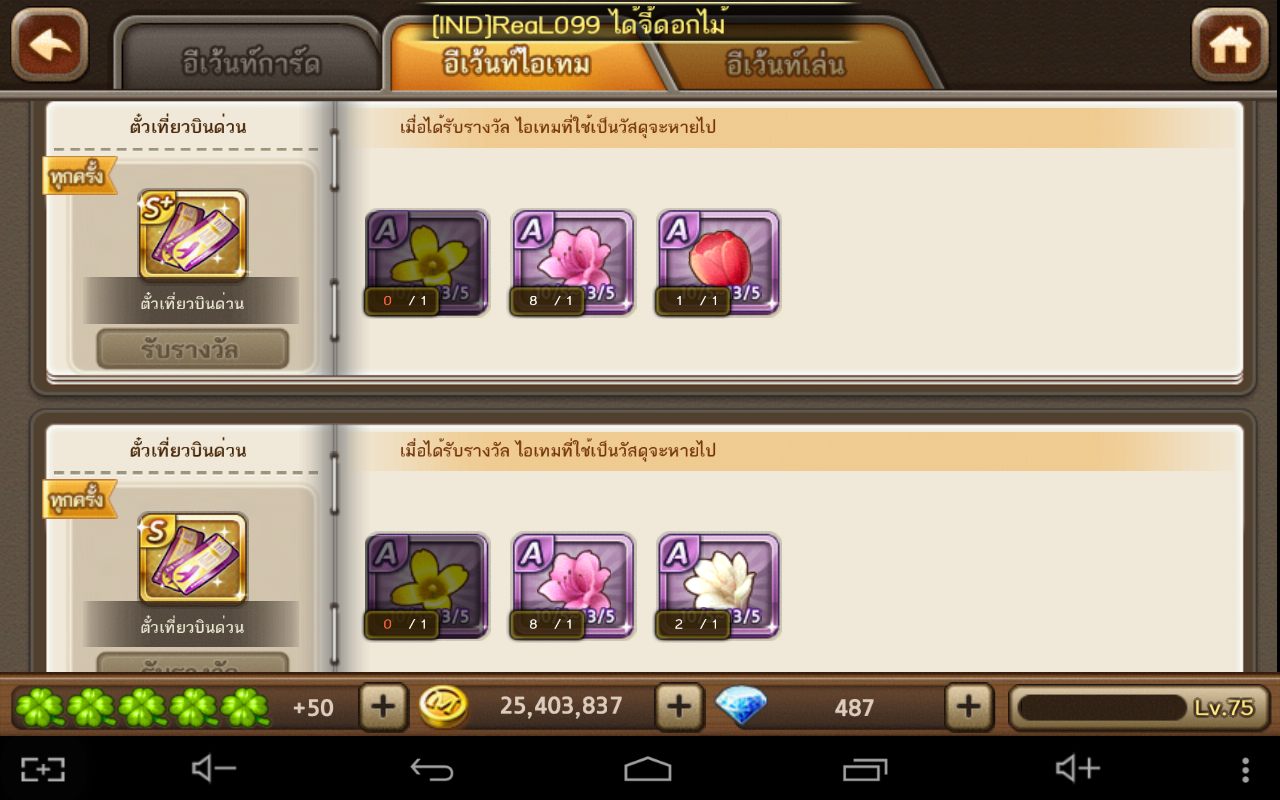 เหลือกล้วยอีก 6 ใบ จะครบ 20 รวมรางวัล ไลน์ กับ ทริปเปิ้ลแล้ว ตอนนี้เหลืองบแค่ทอง 2 M (รวมขายเต๋าลิงแล้ว) เพชร 500 การ์ด S มีเกือบ 20 ใบ แต่ทองไม่น่าจะพออัพ เฮ้อออ ชีวิต ไม่น่าเสียสติกับอีเวรที่ผ่านๆม