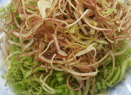 ส่วนผักสีเขียว ดูเหมือนยอดเถาอะไรสักอย่าง กรอบอร่อยดีเหมือนกันค่ะ
