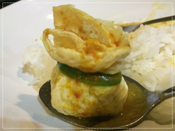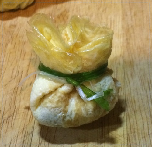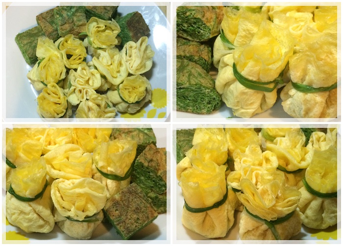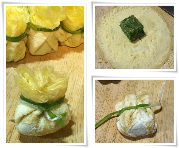 ประกอบร่าง เอาชะอมวางตรงกลาง จับไข่ให้เป็นถุง แล้วเอาต้นหอมมามัดแทนเชือก