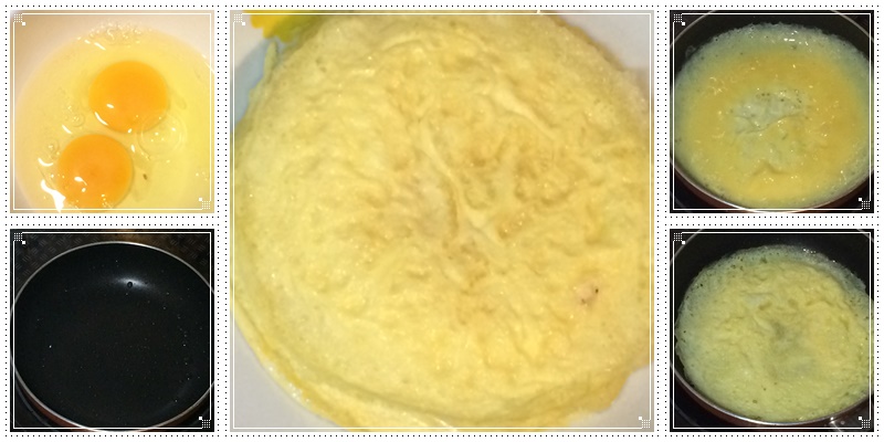 กะทะใบเดิมเช็ดให้สะอาด ทาน้ำมันบางๆ ตั้งไฟกลางอ่อนเหมือนเดิม ตีไข่ 3 ฟองในชามพอเข้ากัน