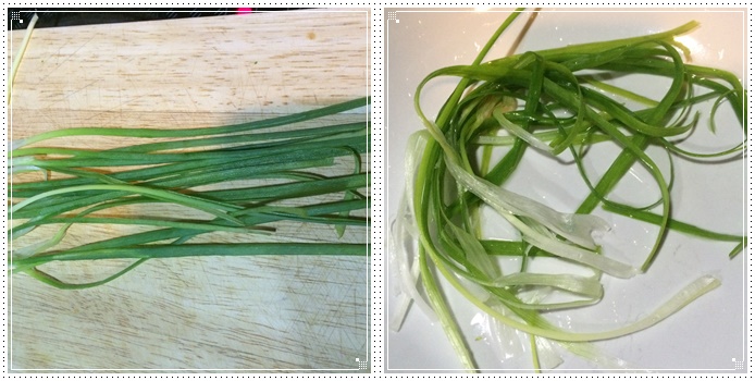 เอาต้นหอมมาผ่าครึ่งเป็นเส้นตามยาว จากนั้นนำไปลวกน้ำร้อนพอให้สลด