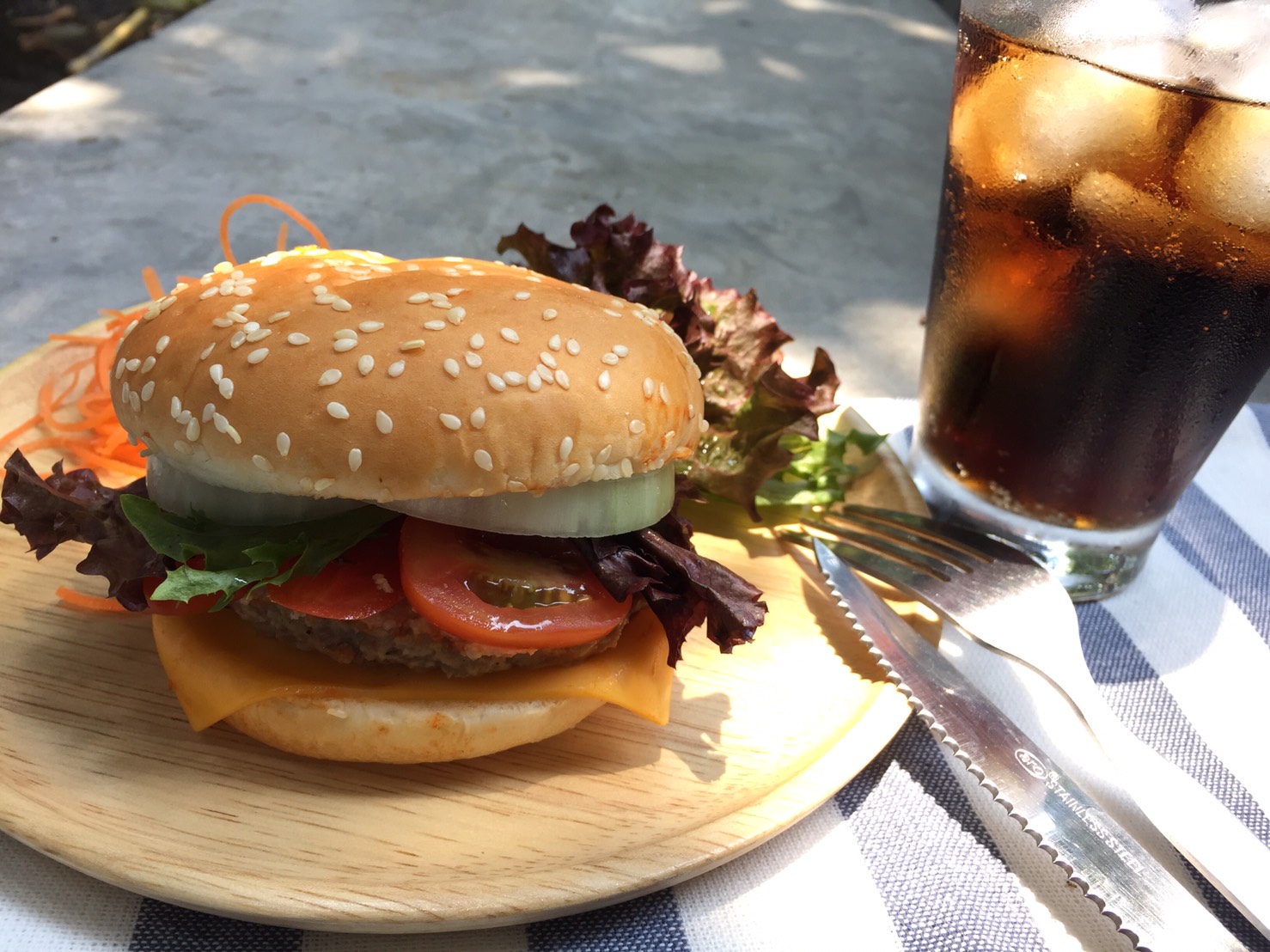 เบอร์เกอร์เนื้อวัว (37 บาท) + โค้ก (17 บาท) + ผักสลัด