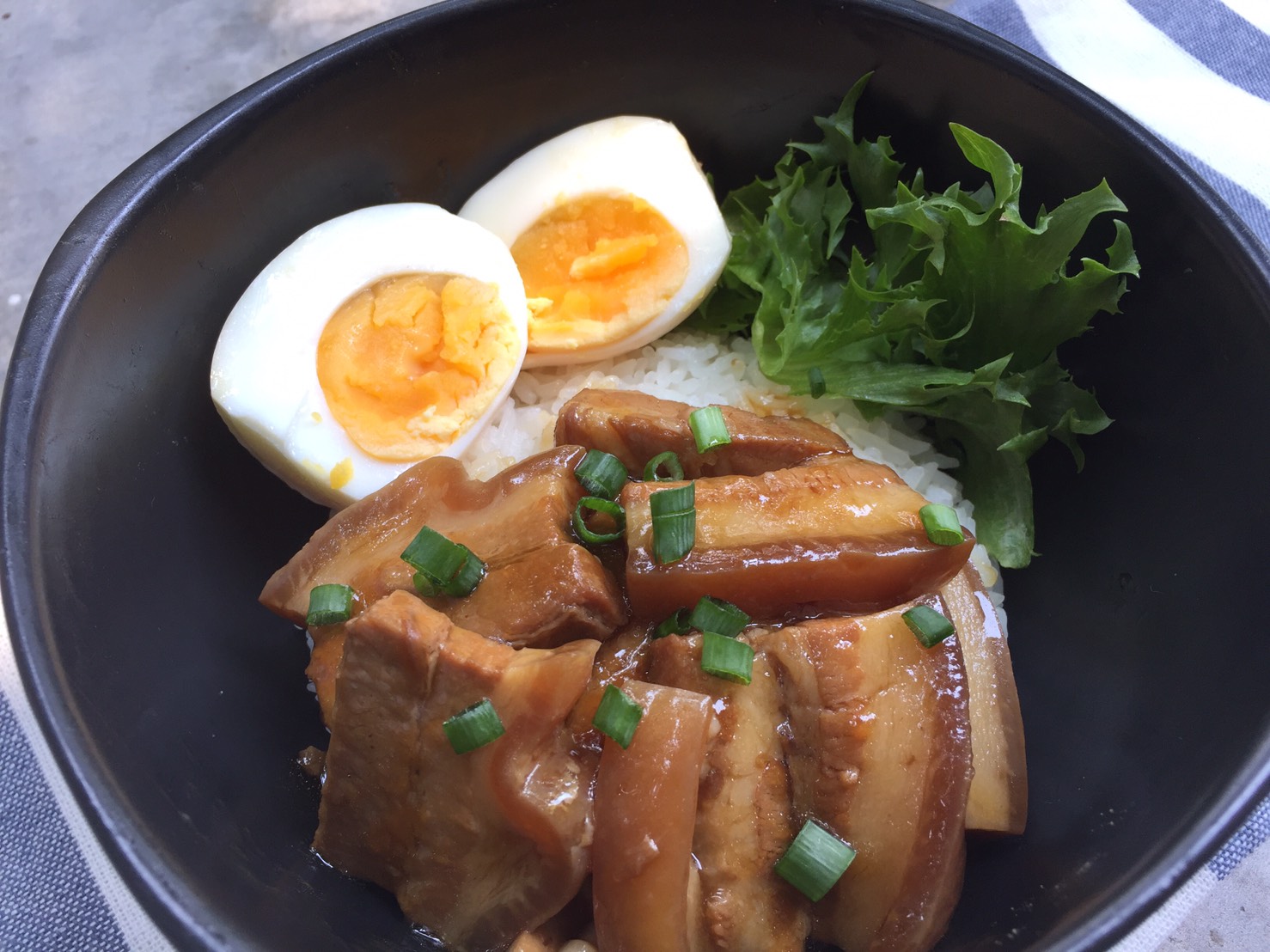 ข้าวสวยร้อนๆ + หมูคาคูนิ (39 บาท) + ไข่ต้มยางมะตูม (16 บาท)