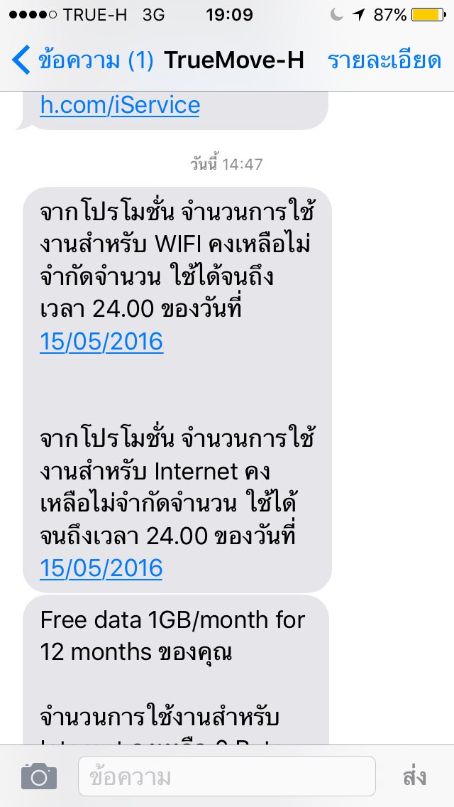 เช็คข้อความแล้ว มันขึ้นว่า ภายใต้ซิมหลักหมายเลข 06404xxxxx และซิมเสริมอีก 1 ซิม จากโปรโมชั่น จำนวนการใช้งานสำหรับ WIFI คงเหลือไม่จำกัดจำนวน ใช้ได้จนถึงเวลา 24.0