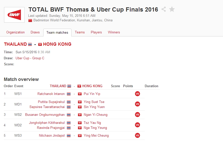 Draw TOTAL BWF Thomas and Uber Cup Finals 2016 มาแล้ว มาชมกันเลย