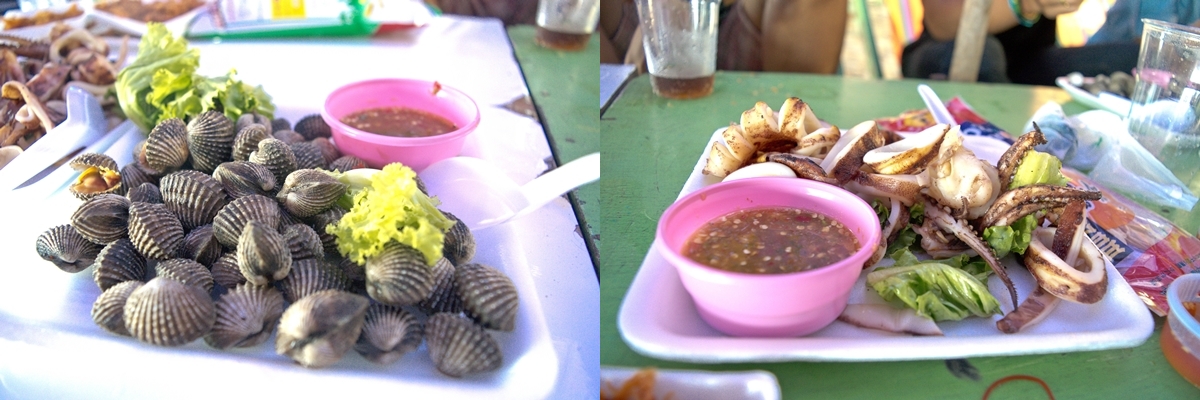 แล้วเราก็กลับมาที่นั่งริมทะเลของเรา พร้อมกับ หอยแครงลวกราคา 150 บาท (ได้ประมาณครึ่งโล) แม่ค้าใจดีแถวให้ด้วย แล้วก็ได้ ปลาหมึก 170 บาท
