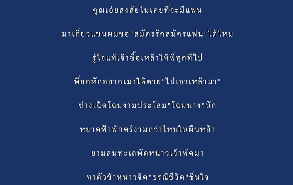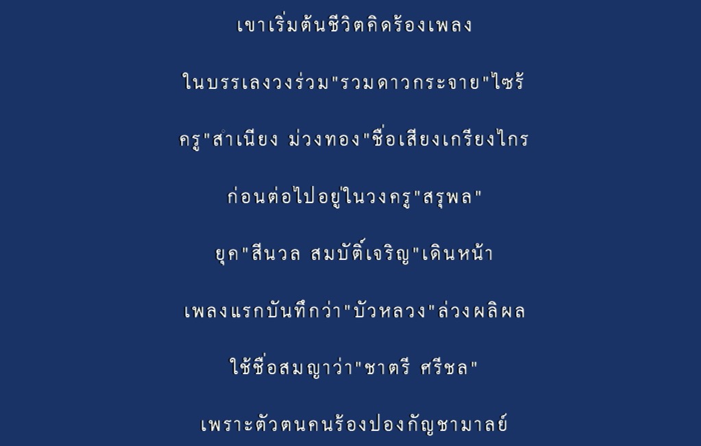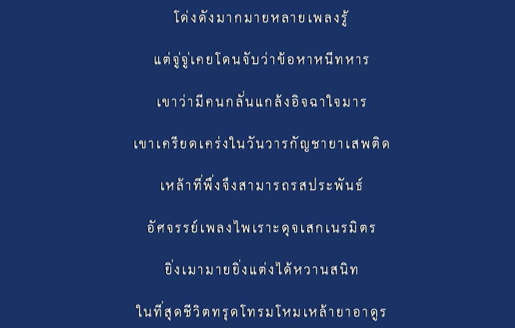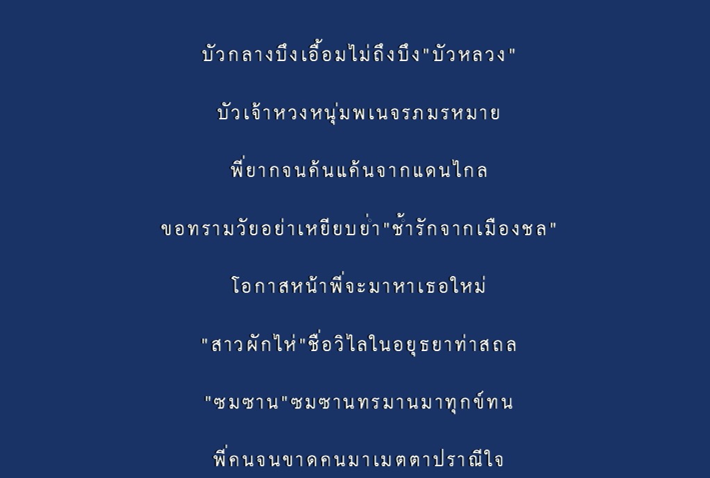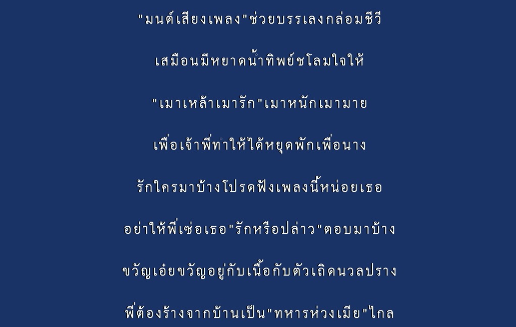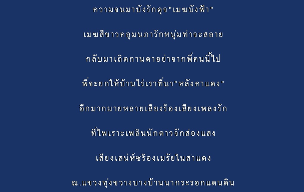https://www.youtube.com/watch?v=mpUqHh6UV60https://www.youtube.com/watch?v=0mr6vgM180o08.43 น. ดาวลูกทุ่ง ประดับฟ้า ลูกกรุุงไกรเธอเป็นดาว หนึ่งในดวงใจ ดาวในฝันลาลับเเล้ว แว่วเพียง เสียงจำนรรจ์นา