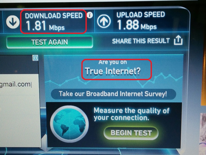 วันนี้ตอน 11.30 น. ไปนั่งทานกาแฟที่ True Shop สาขาพาราไดซ์ถนนศรีนครินทร์ ต่อไวไฟ TrueMoveH ได้ความเร็วดาวโหลด 1.81 Mbps ไหนโฆษณาว่าเร็วแบบรถไฟความเร็วสูง แต่ที่ True Shop เองในกรุงเทพได้เหมือนซาเล้งขาถึบ?