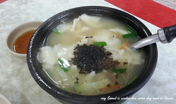 ชื่อร้าน Samcheongdong Sujebi ซูเจบิที่นี่อร่อยดีค่ะ จะเป็นแผ่นแป้งในน้ำซุปซีฟู้ด