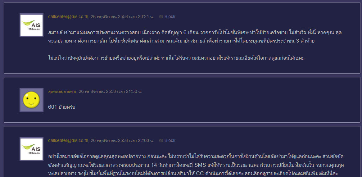 เมื่อคุณเบื่อค่ายเอไอเอส ที่เสียงคุยขาดๆหายๆเน็ตช้ามากและรู้สึกหมดเร็วผิดปกติ คุณเลยใช้สิทธิ์ย้าย แต่คุณไม่สามารถย้ายค่ายได้เพราะคุณได้รับสิทธ์12เดือนคุณก็ต้องก้มหน้าก้มตารับไป แต่สิ่งที่ผมได้รับรู้คือคุณจะเชื่อข้อมูลที่ccที่มาตอบในพันทิพได้อย่างไรในเมื่อพูดไม่ตรงกันในแต่ละครั่ง